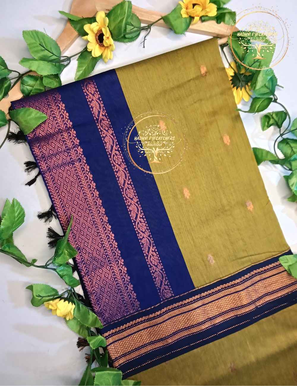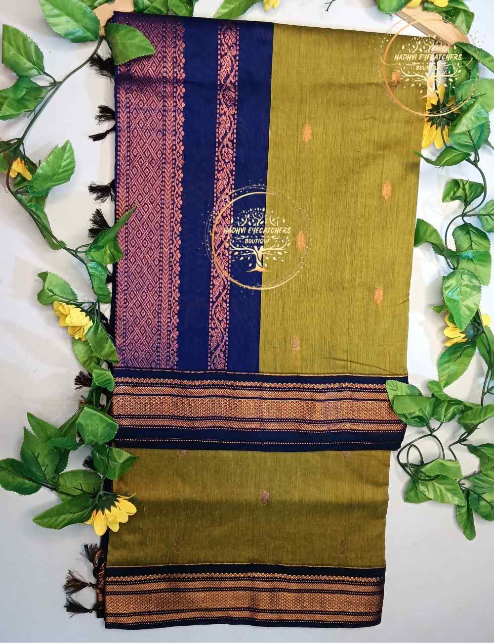 Grace your wardrobe with this Moss Green Kalyani Cotton Saree, highlighted by a bold royal blue border woven in copper zari. The muted green body features minimal woven motifs that lend a refined and graceful appearance.