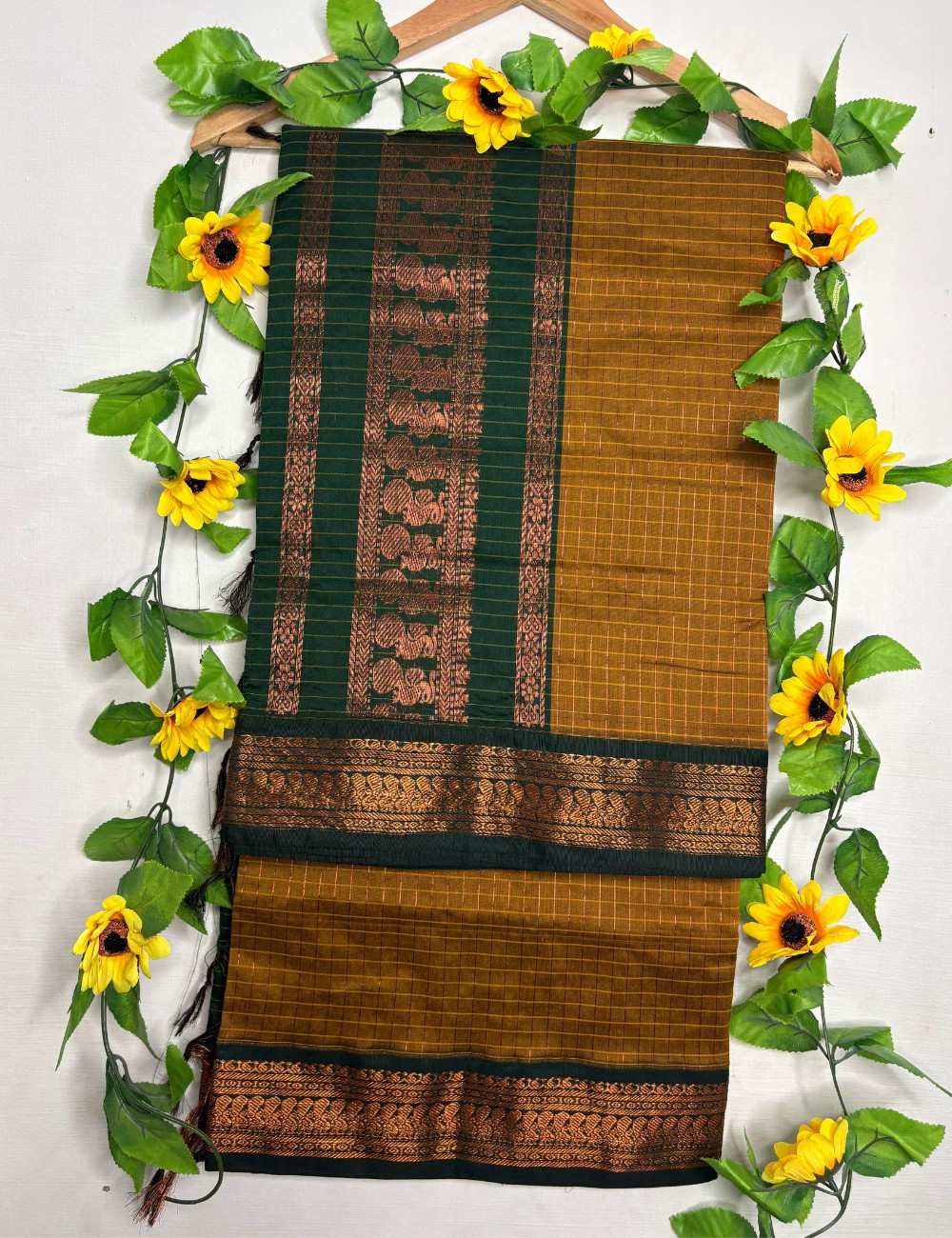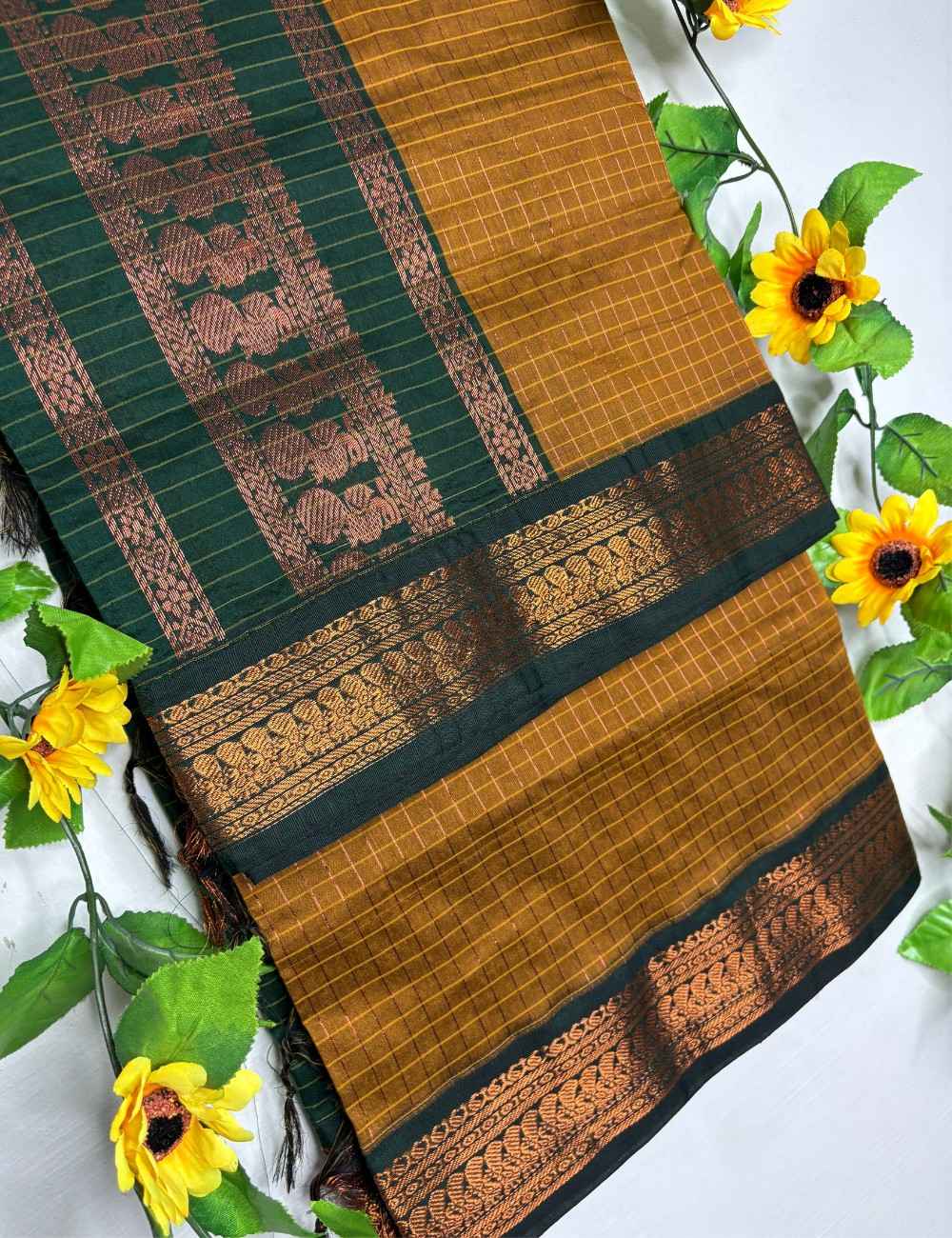 This saree blends warmth and tradition with its mustard brown body woven in fine white checks. The tone is grounded and elegant, making it ideal for daytime functions, cultural gatherings, and serene celebrations. The subtle grid adds texture and balance to the earthy palette.