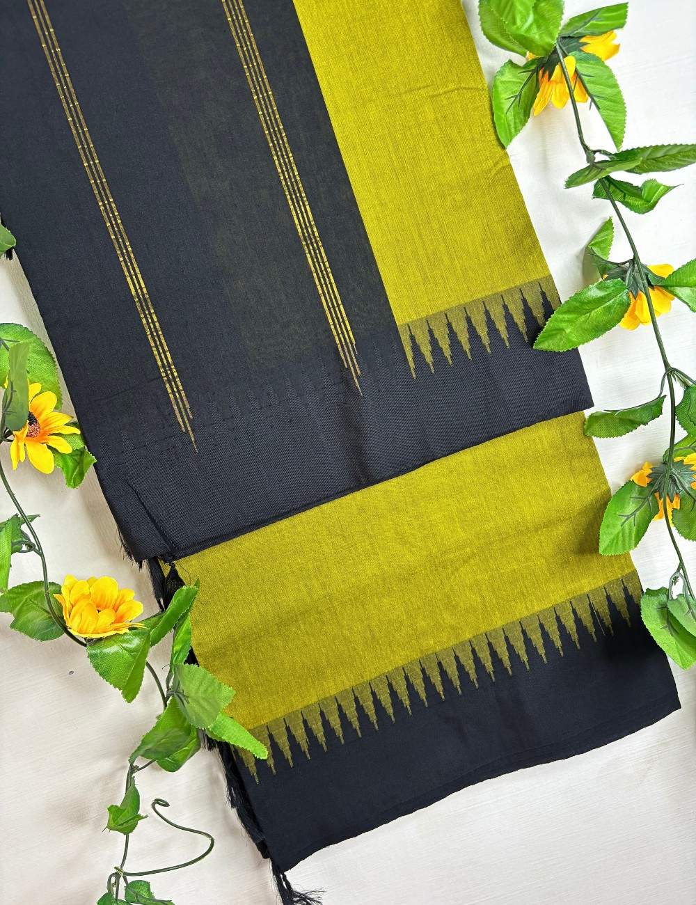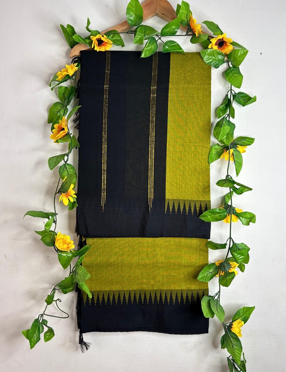 Handwoven in Raga Kalyani cotton, this saree features a vibrant mustard yellow section contrasted by a rich black body. The two tones are joined by a jagged korvai temple border in triangular motifs, creating a dynamic transition that evokes traditional South Indian architecture. Fine vertical golden lines on the black portion add a refined accent, catching light with understated elegance.