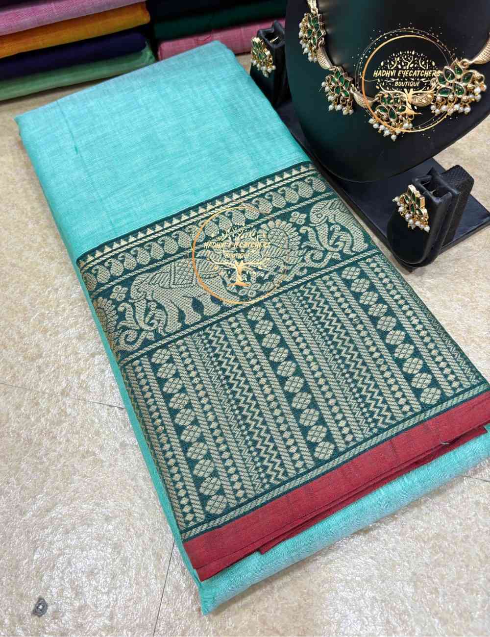 This aqua blue Narayanpet cotton saree is paired with a teal elephant ghajra border. Fresh and vibrant in look. Perfect for everyday elegance.