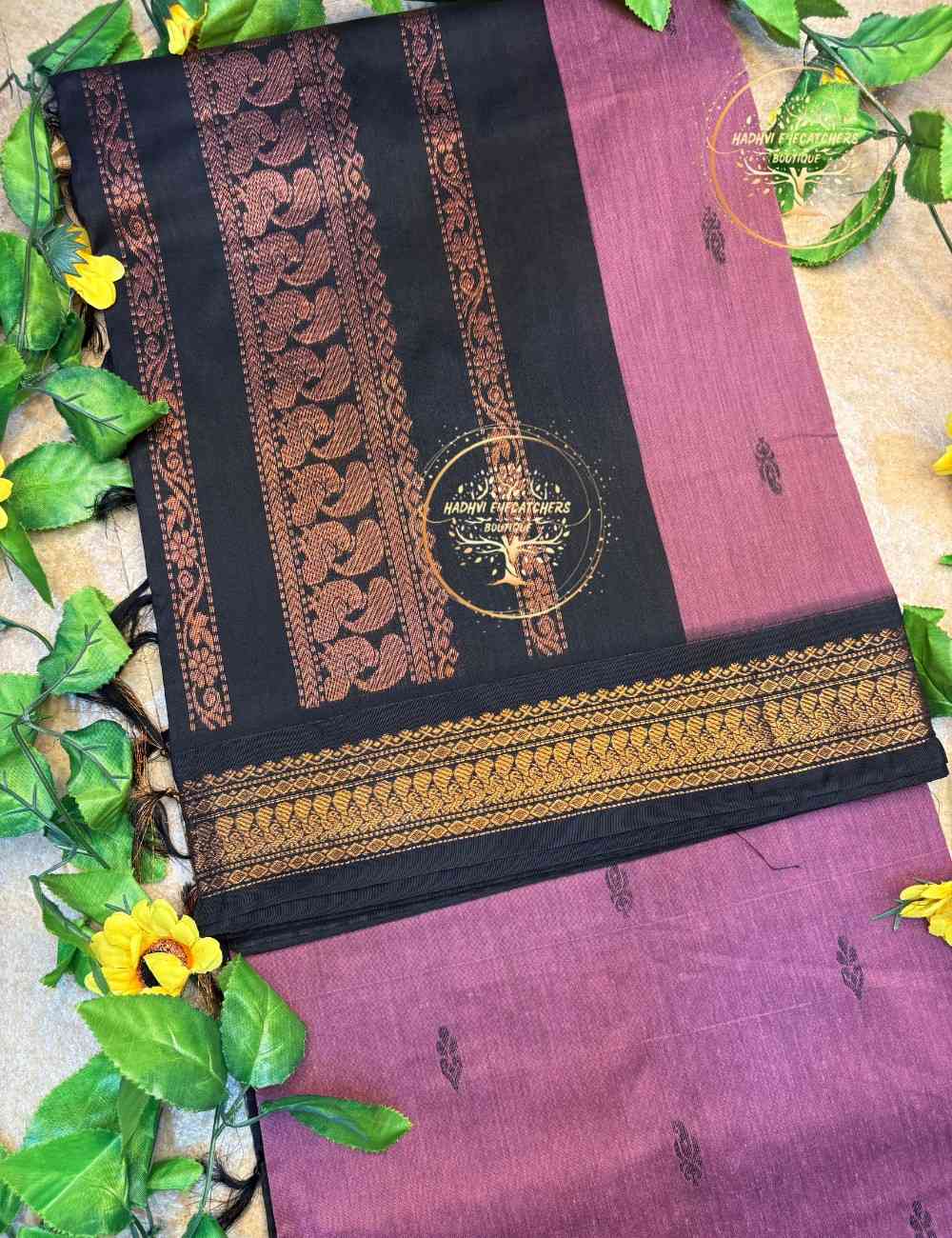 This sophisticated mauve purple Kalyani Cotton Saree offers a soft, elegant look suited for both casual and semi-formal occasions. The breathable cotton fabric makes it comfortable even in warm weather. Its black border with finely detailed copper zari work adds a touch of traditional richness without overpowering the design. The saree features subtle woven motifs across the body that enhance its graceful appearance. This mauve Kalyani cotton saree with black copper zari border is ideal for office wear, family gatherings, and day functions.
