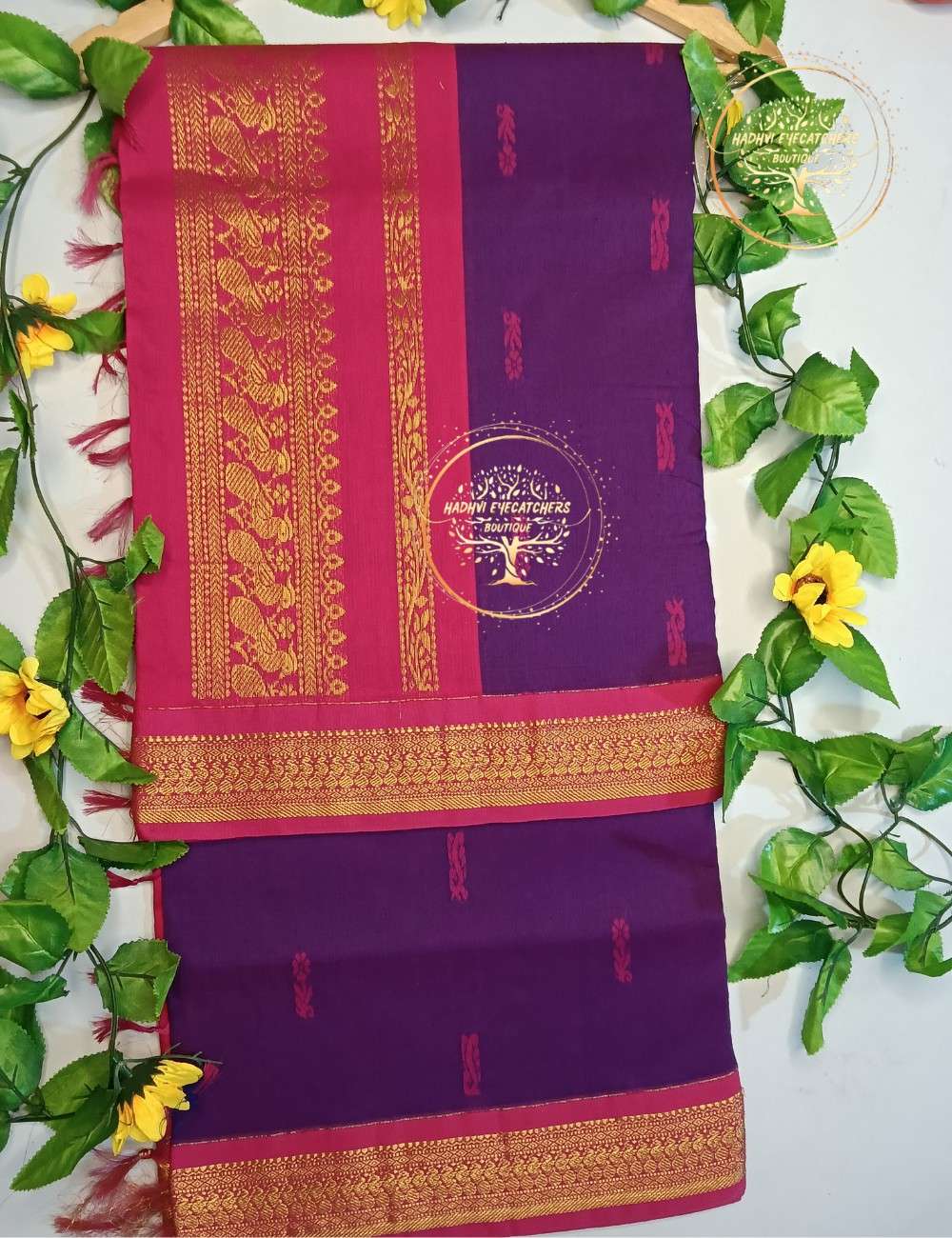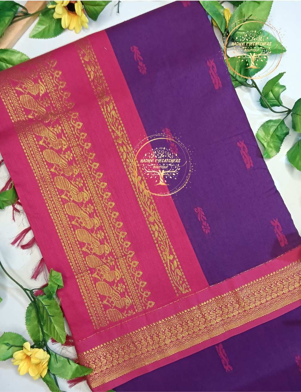 The saree features a rich rani pink border paired with a deep purple body, creating a striking contrast that looks graceful yet bold. The highlight is the intricately woven gold zari border, showcasing classic traditional motifs that add a luxurious touch without overpowering the overall look. Delicate woven buttas on the body enhance its elegance and lend a refined finish.
