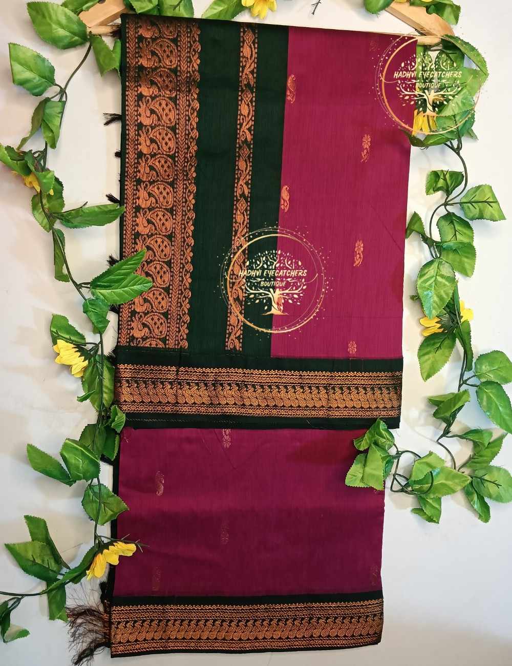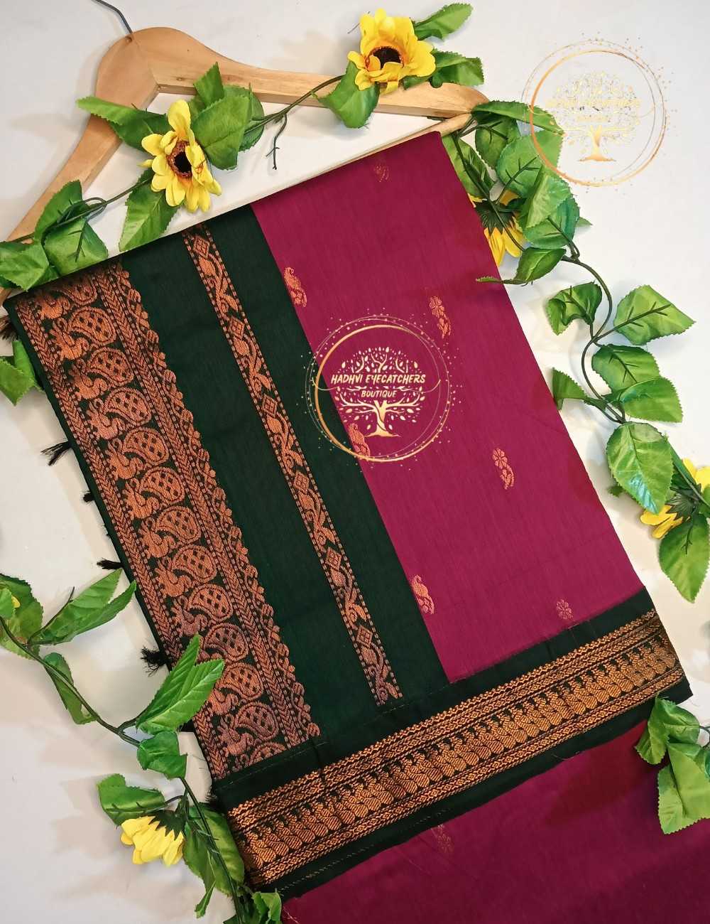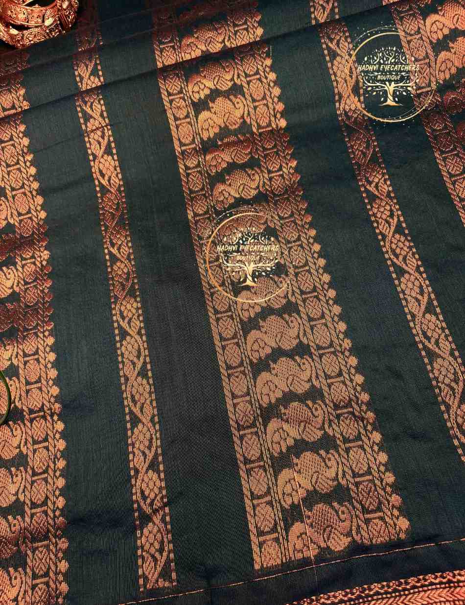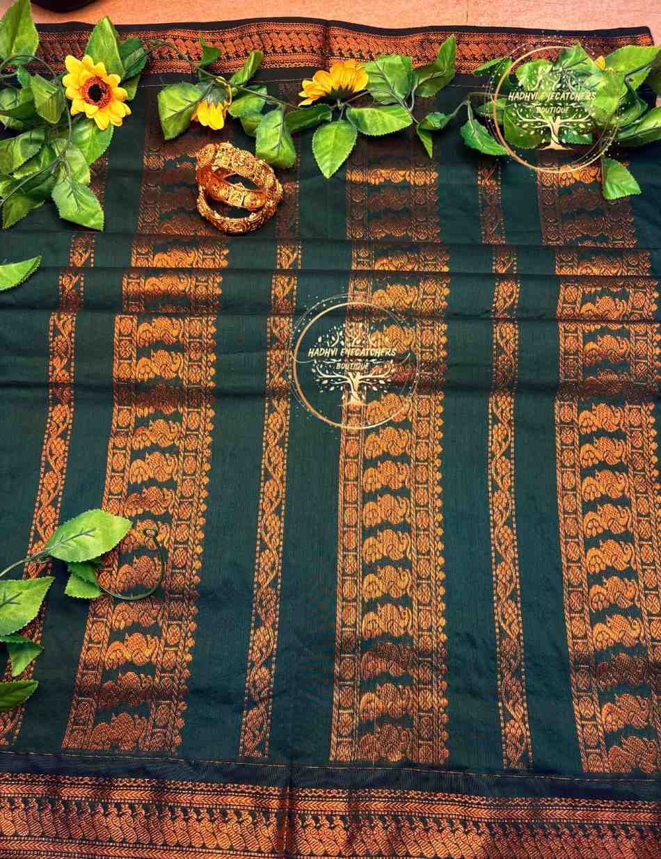 Rich and elegant, this Kalyani Cotton Saree Wine Maroon with Bottle Green Copper Zari Border brings together deep color and traditional craftsmanship. The wine maroon body is accentuated with subtle woven motifs for a luxurious feel. A contrasting bottle green border highlighted with copper zari weaving adds heritage charm and festive appeal. The matching pallu enhances the saree with coordinated zari detailing. Made from premium Kalyani cotton, this saree ensures comfort, durability, and graceful drape.