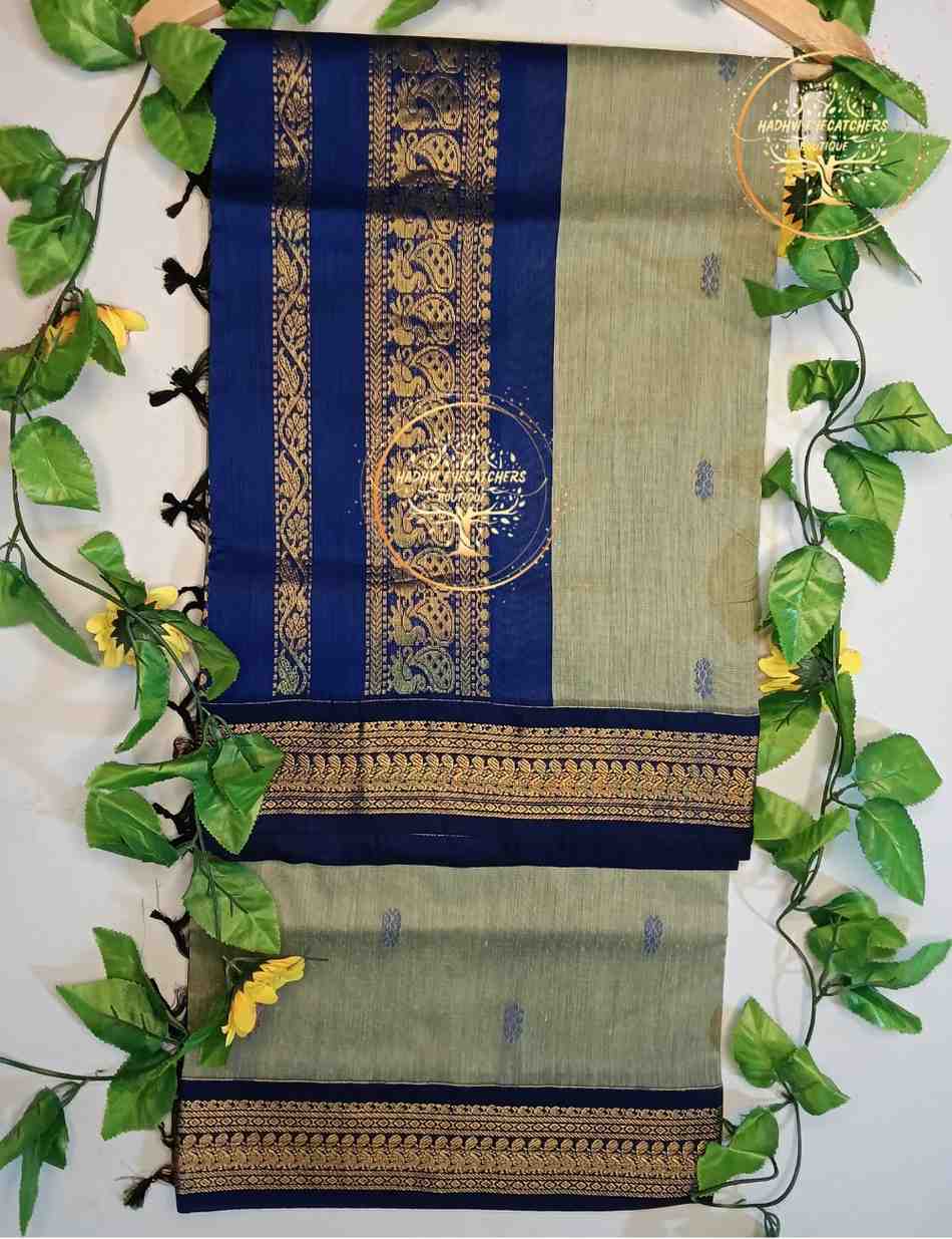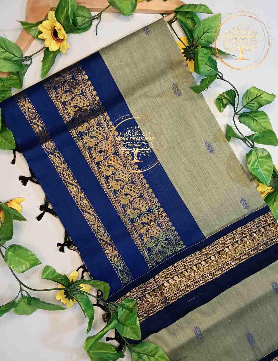Gracefully blending tradition with subtle elegance, this Royal Blue & Ash Grey Kalyani Cotton Saree is a timeless addition to your ethnic wardrobe. The deep royal blue body is beautifully enhanced with an intricately woven antique gold zari border featuring traditional motifs. The contrasting ash grey pallu, highlighted with delicate woven buttas, adds a soft, sophisticated finish.