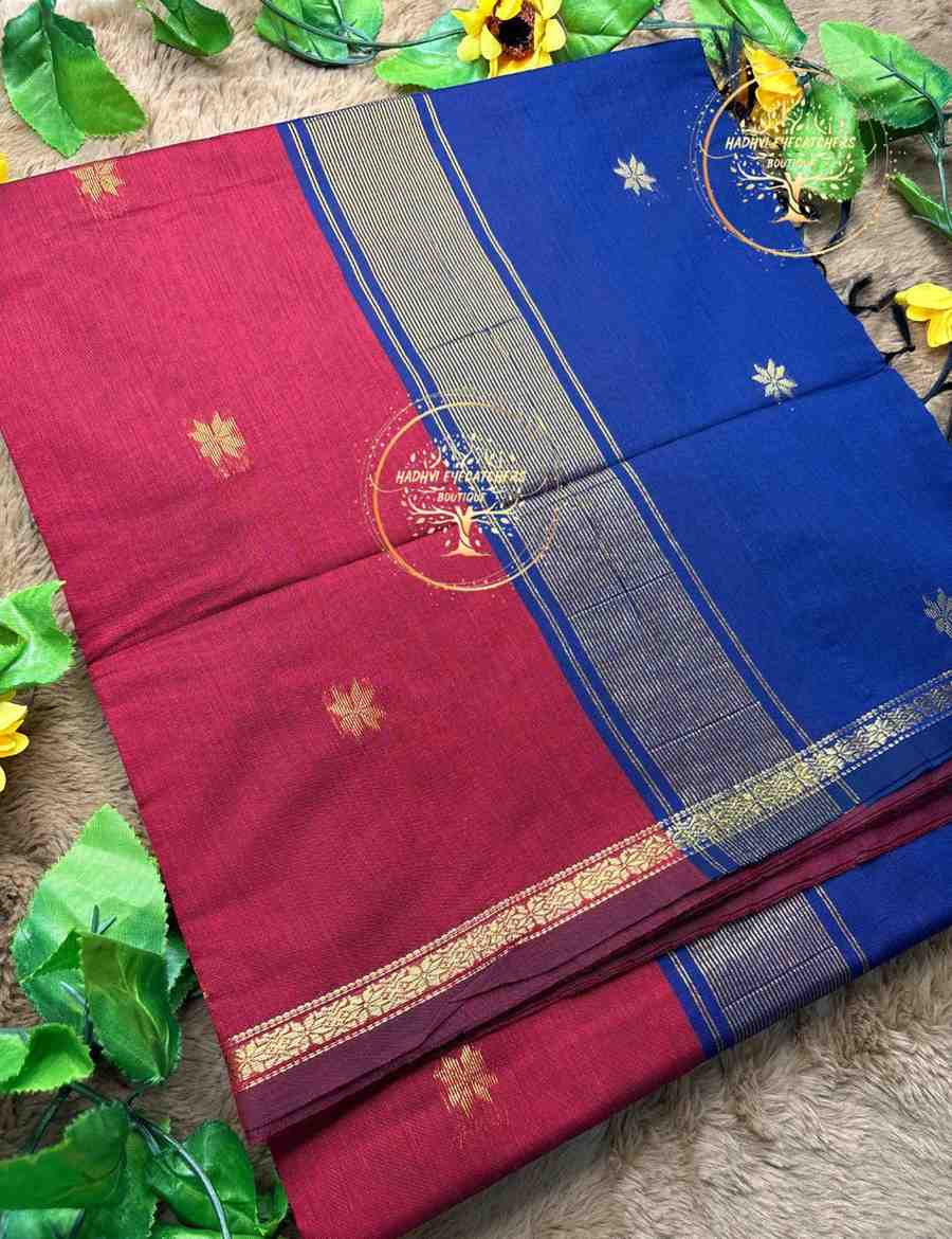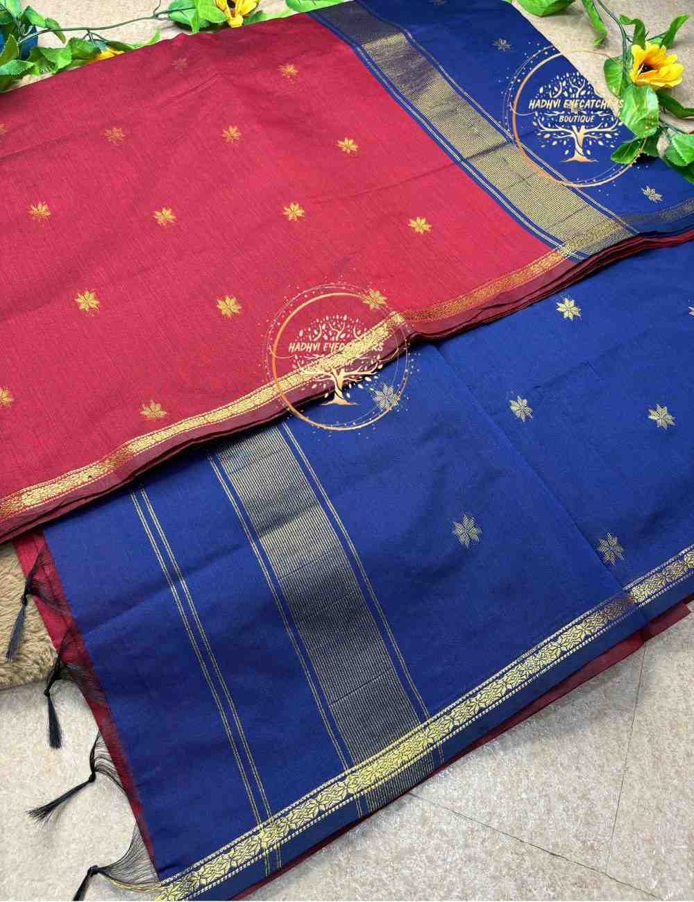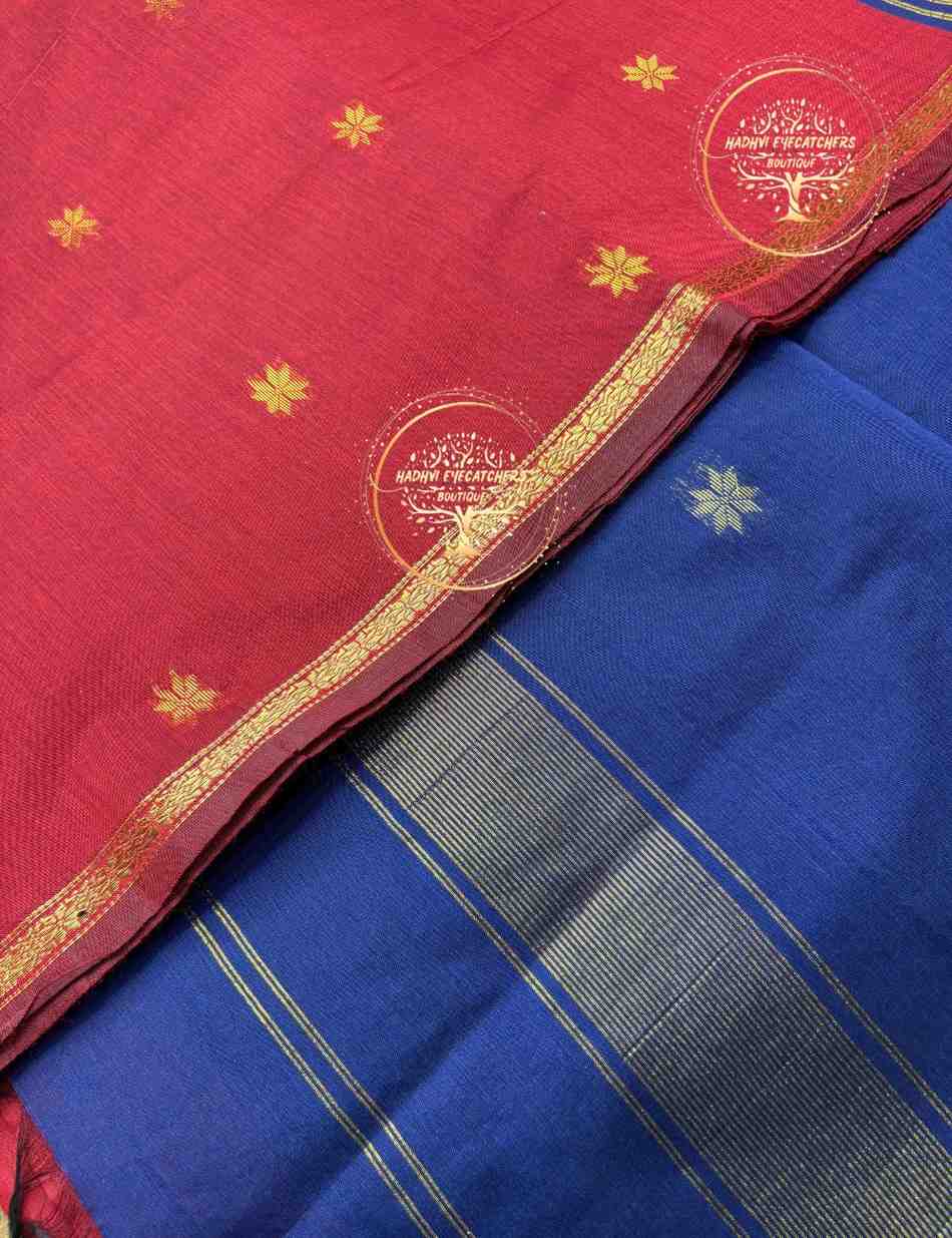 A classic red Semi Maheswari silk cotton saree highlighted with a rich royal blue contrast and elegant gold zari accents.