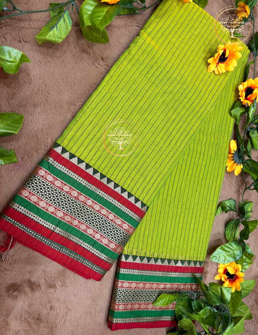 Crafted from premium pure cotton, the saree is soft, airy, and skin-friendly, making it ideal for long hours of wear. The parrot green body is enhanced with subtle vertical stripes, while the contrasting pallu showcases classic geometric motifs and multicolor woven stripes in maroon, green, black, and ivory tones.