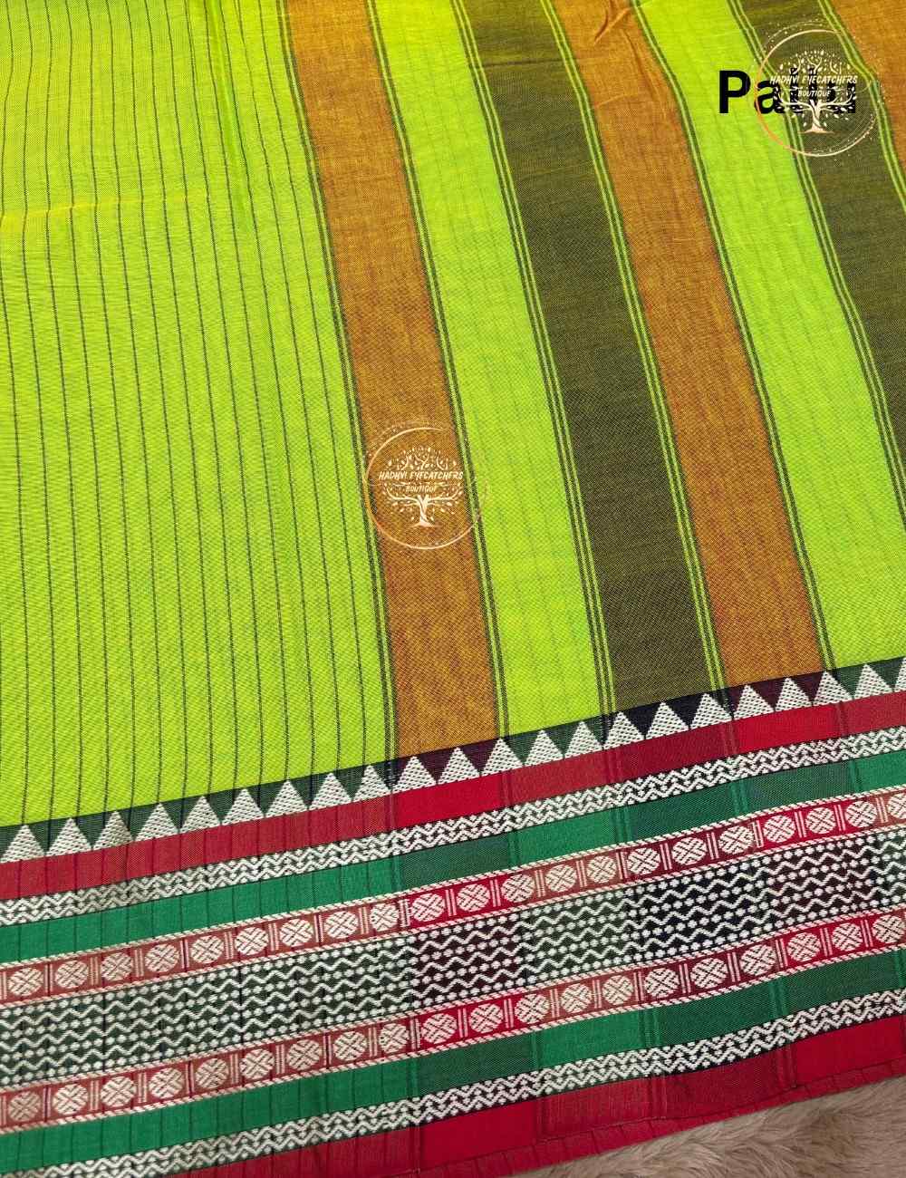Pavani-Narayanpet Parrot Green Stripes Cotton Saree