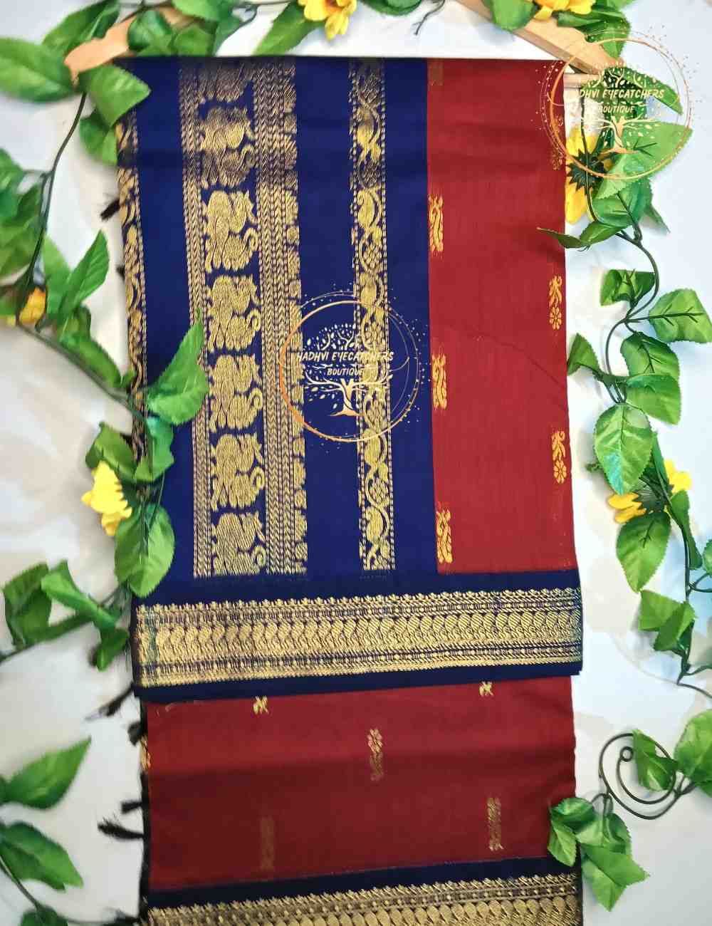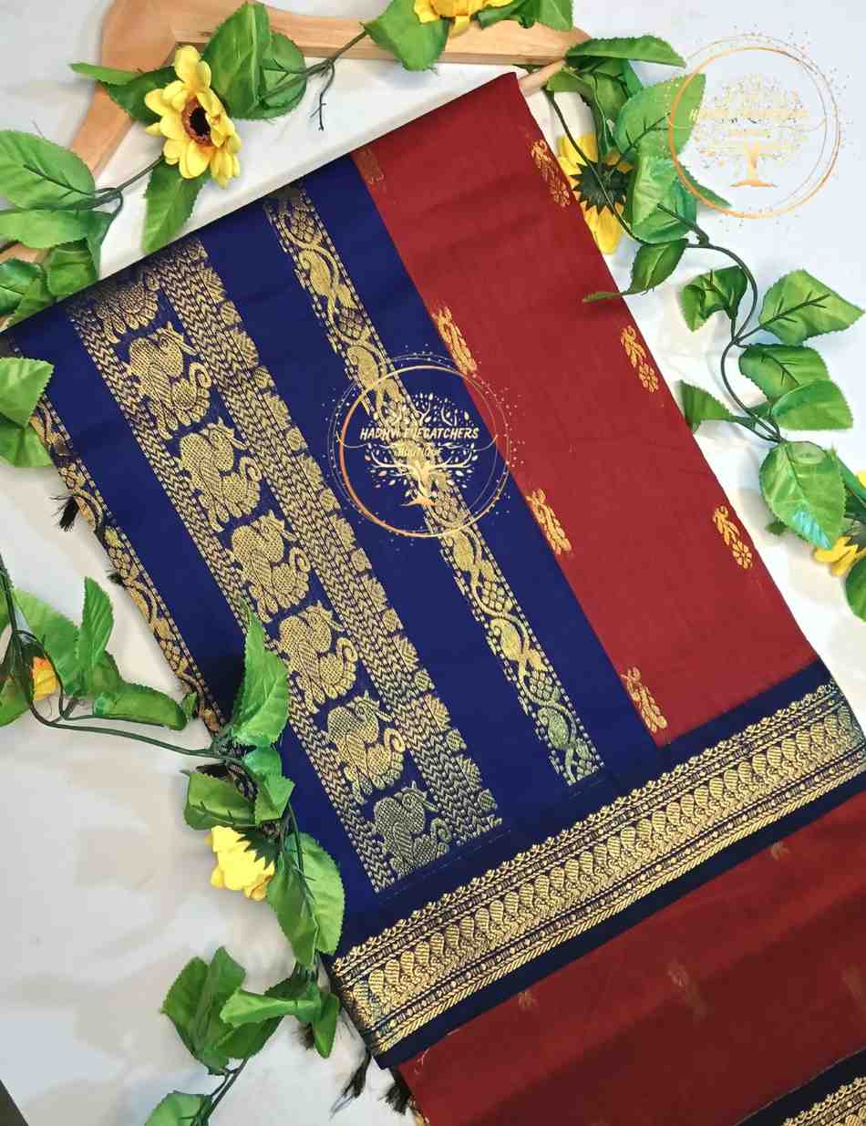 Add a touch of regal charm to your wardrobe with this Wine Red Kalyani Cotton Saree, highlighted by a striking Royal Blue gold zari border. The deep wine red hue exudes richness and tradition, while the intricate zari work enhances its festive appeal. Designed in breathable cotton, this saree ensures comfort without compromising on elegance—perfect for special occasions and traditional celebrations.