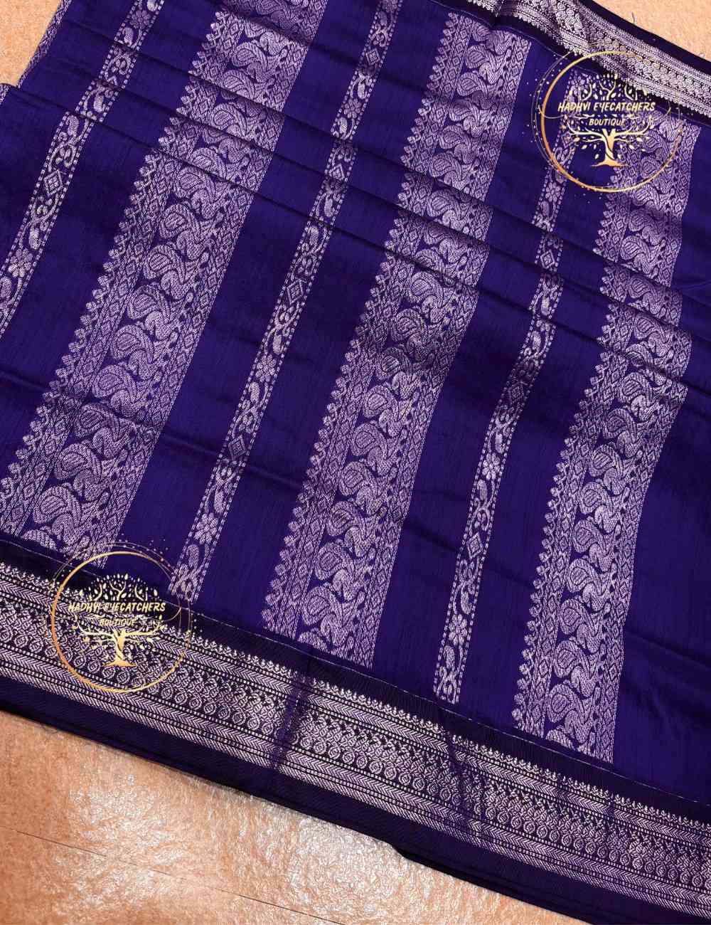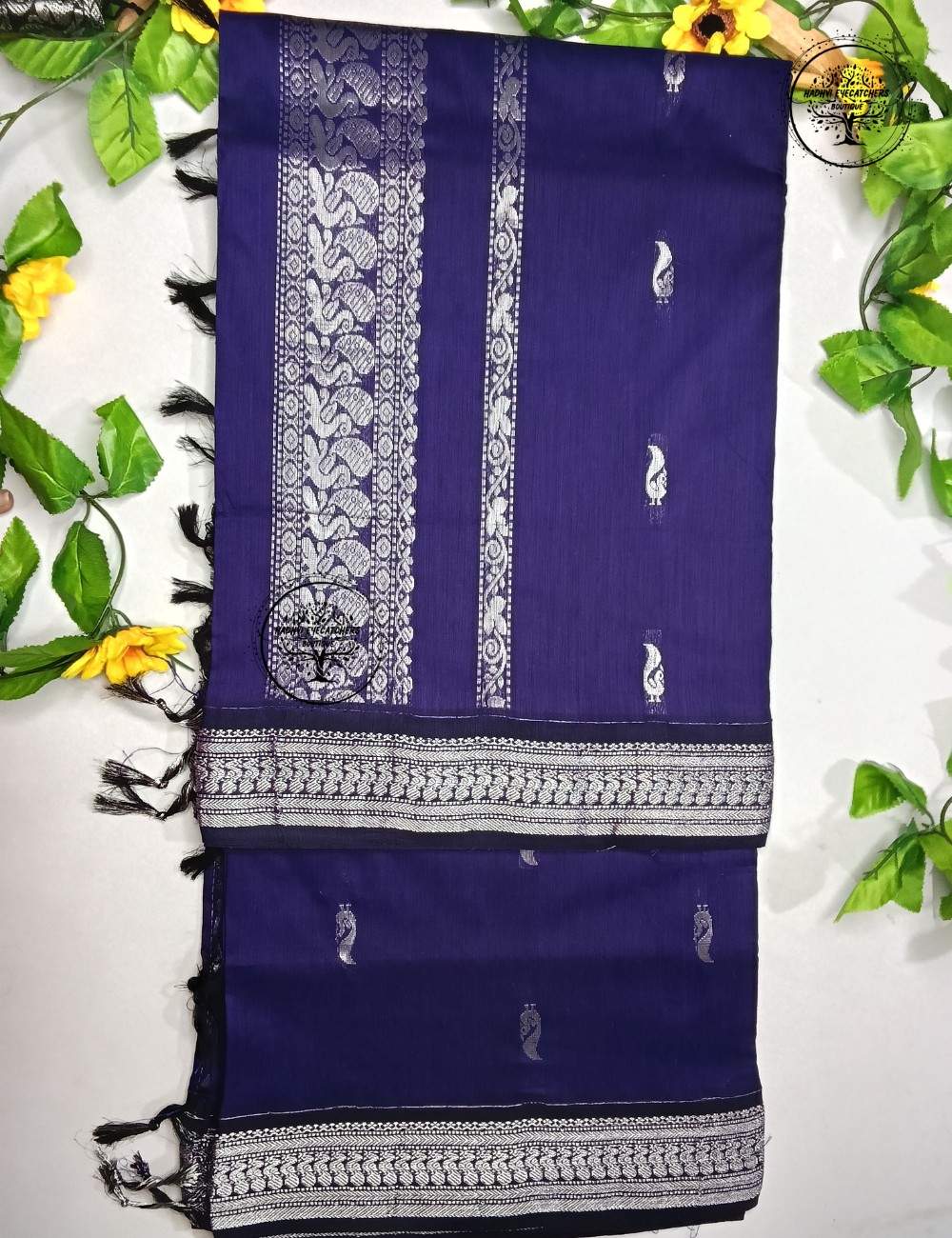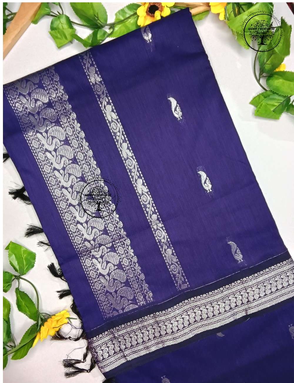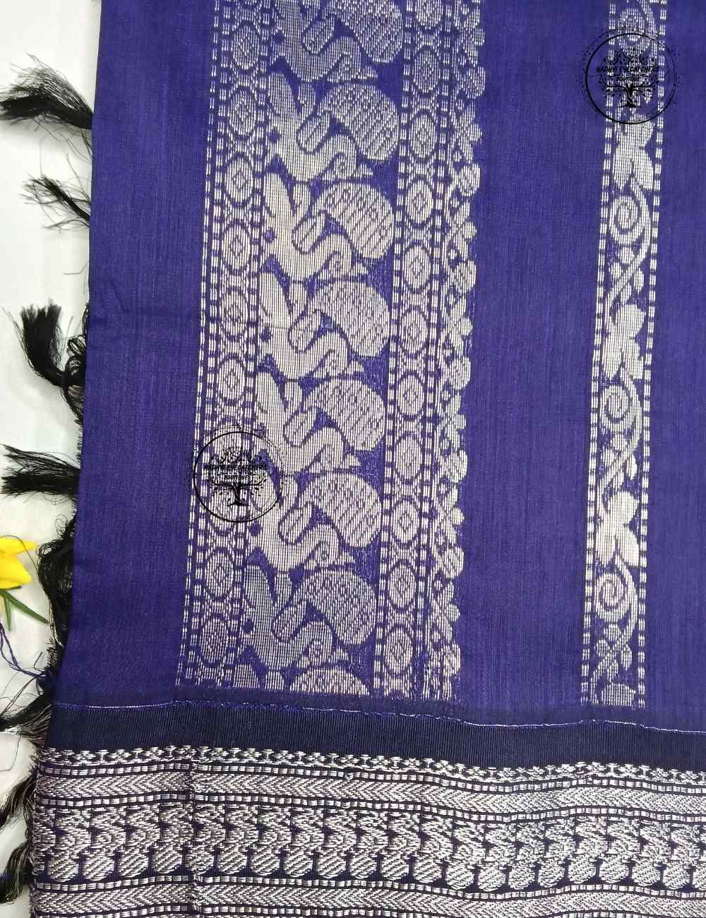 This navy blue Kalyani cotton saree is a perfect blend of simplicity and traditional elegance. The deep navy blue body is adorned with subtle woven motifs that add a graceful touch without overpowering the overall design.