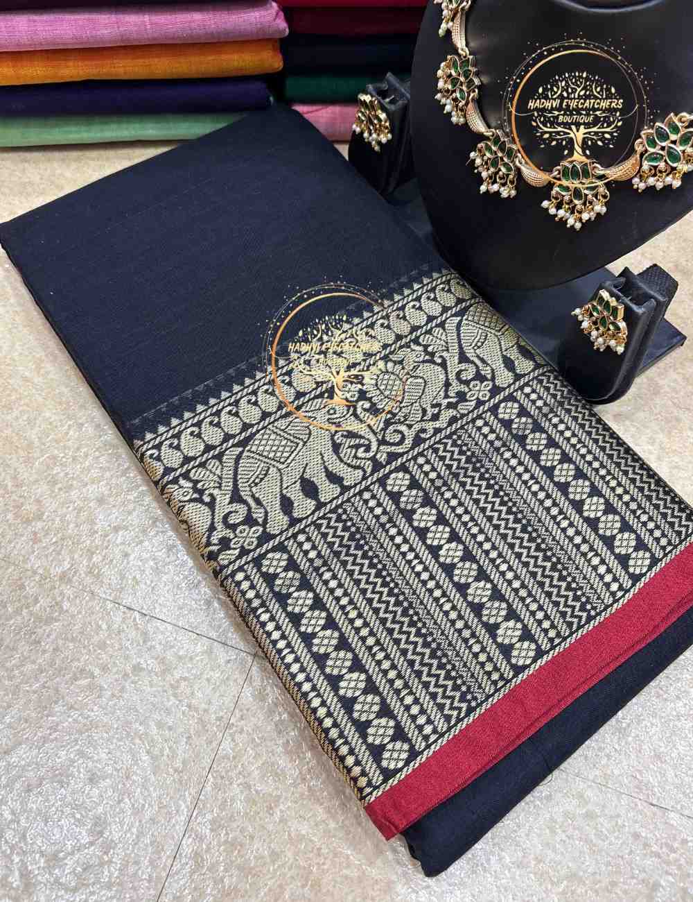 This midnight blue Narayanpet cotton saree features a contrasting grey elephant ghajra border. Elegant and timeless. Suitable for both casual and festive wear.