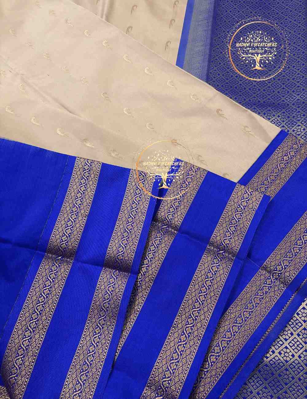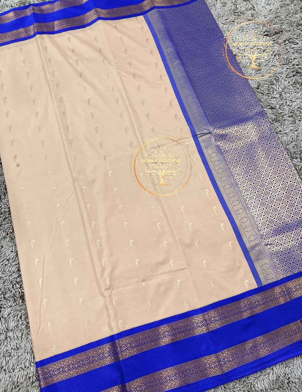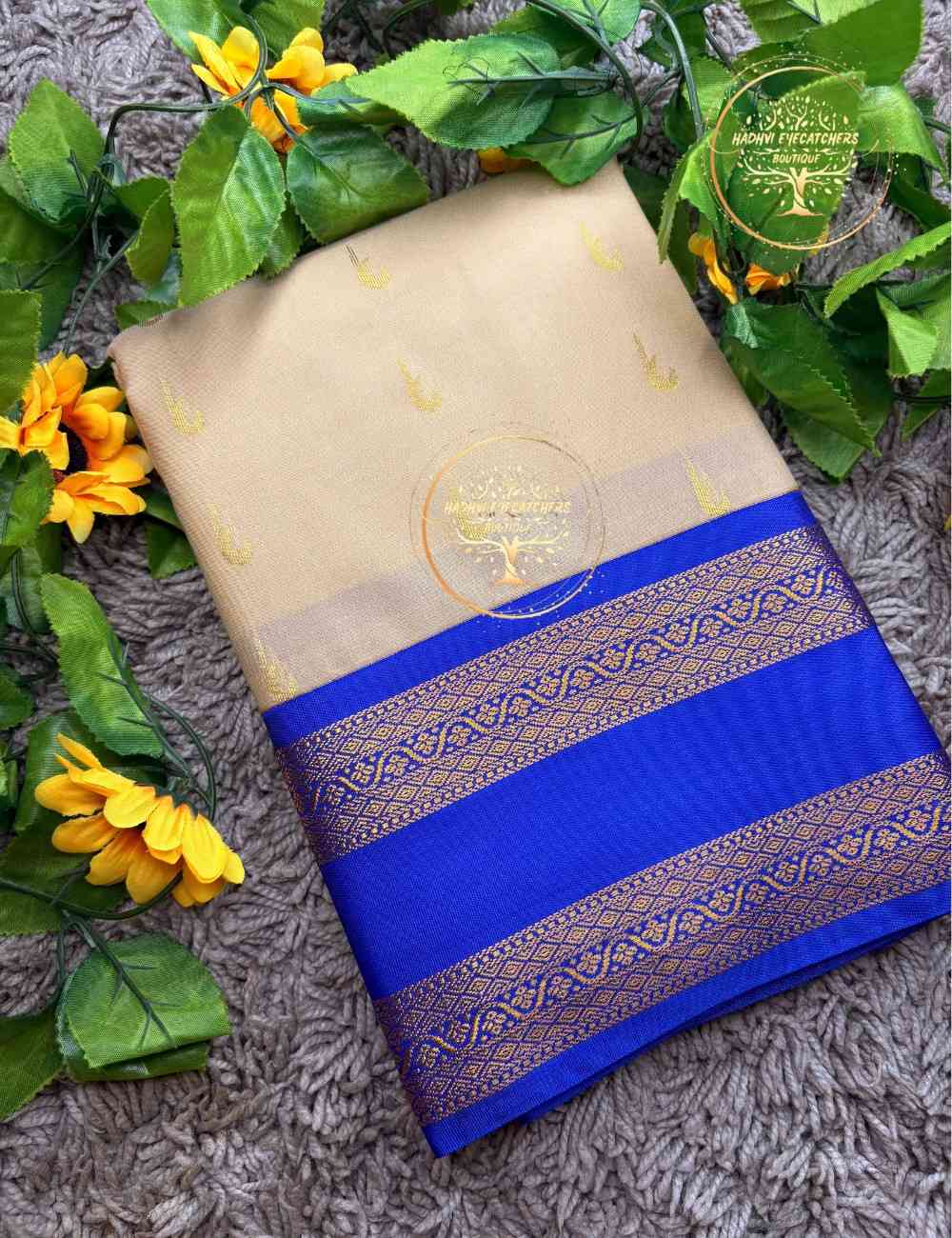 This classic Kanchi Soft Silk Saree features a subtle beige body paired with a bold royal blue border woven in shimmering gold zari. The soft silk texture ensures comfort while giving the saree a rich and elegant appearance. Small gold zari motifs are tastefully placed on the body, enhancing its traditional charm. The broad blue border showcases intricate zari patterns that reflect authentic Kanchipuram craftsmanship. Perfect for festive occasions, poojas, and family functions, this saree is a versatile addition to your ethnic wardrobe. Pair it with a contrast blouse for a refined look.