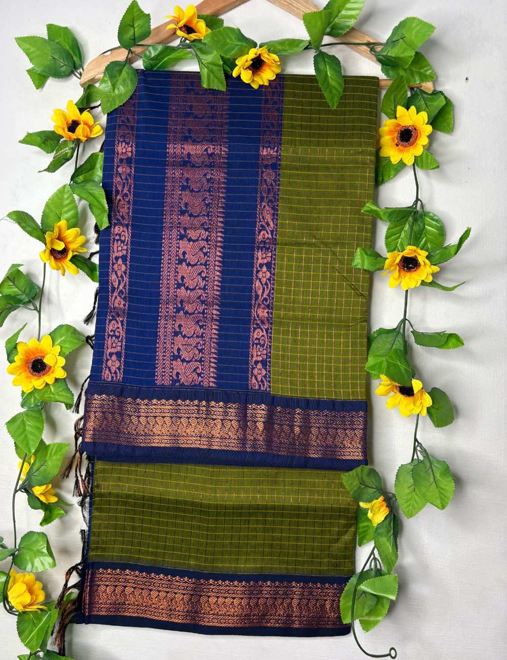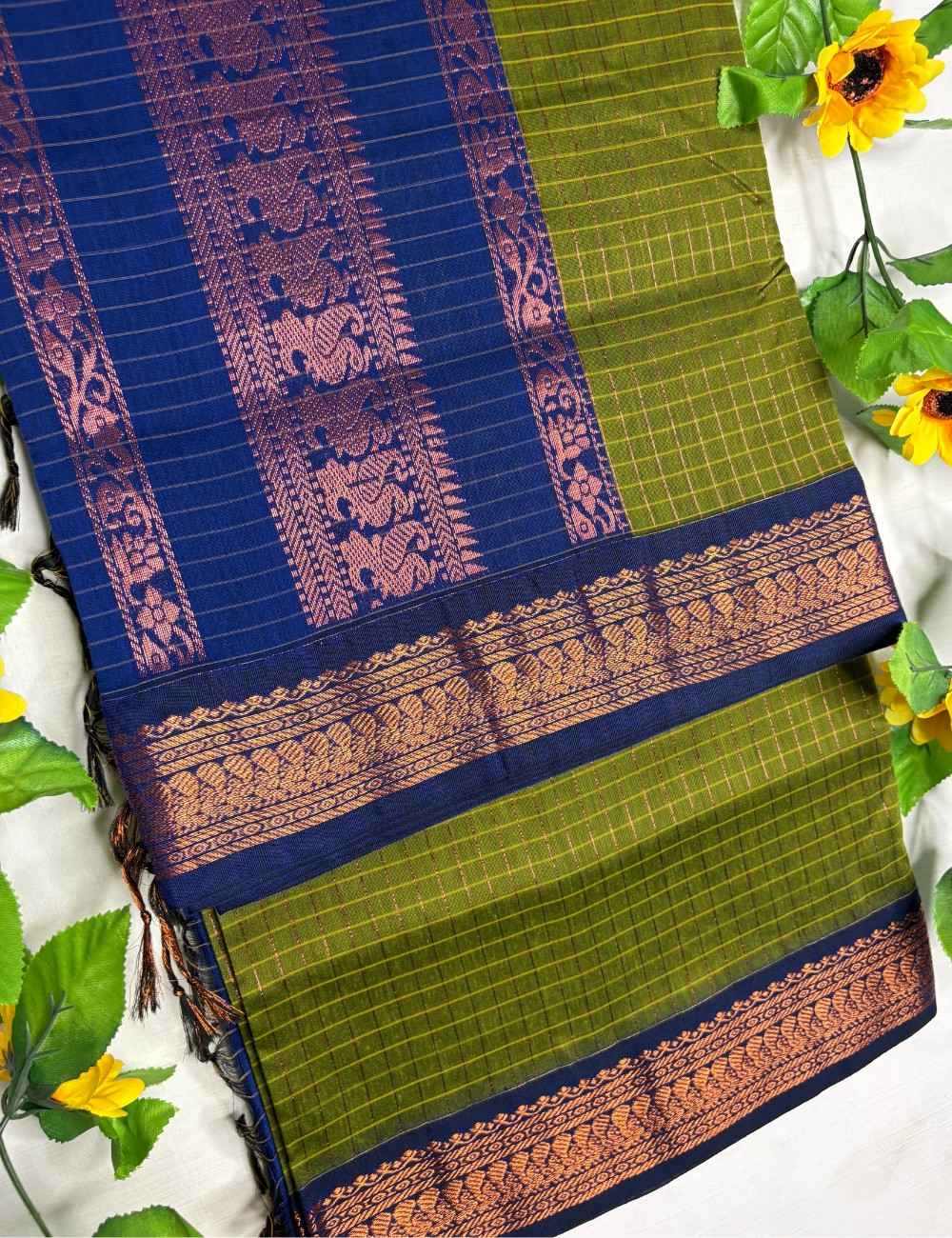 This saree blends muted sophistication with festive detail. The olive green body features a copper checkered weave in classic Checks Kalyani cotton, while the royal blue border and pallu are adorned with copper zari motifs — florals and leaf patterns that evoke temple artistry. The earthy olive paired with deep blue creates a graceful palette ideal for cultural gatherings and serene celebrations.