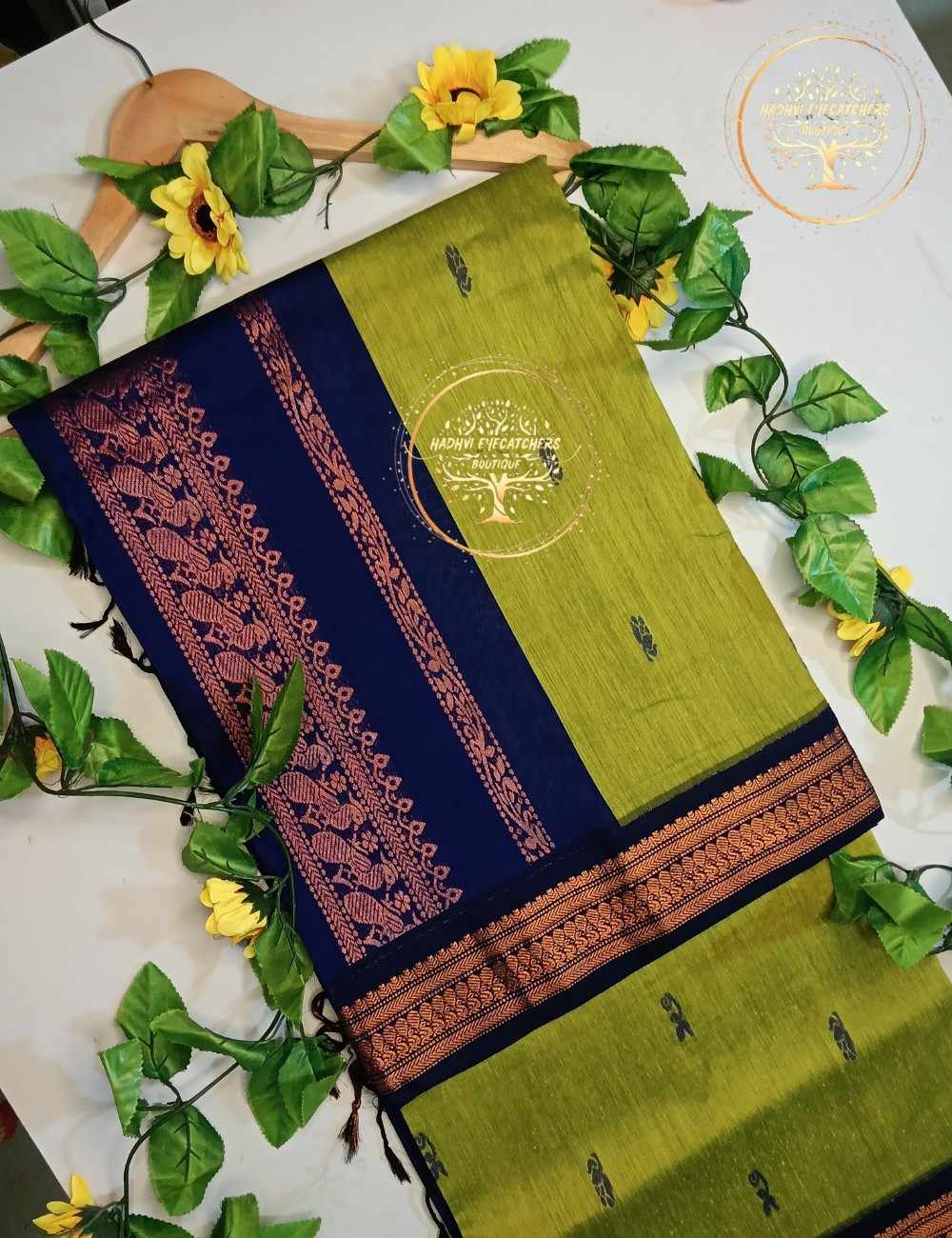 Bring home understated elegance with this Olive Fern Kalyani Cotton Saree, featuring a rich royal blue border woven with traditional copper zari. The olive-toned body is adorned with delicate woven buttas that add a graceful charm without overpowering the look.