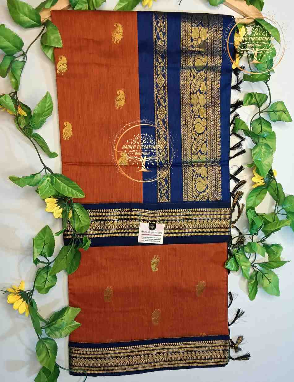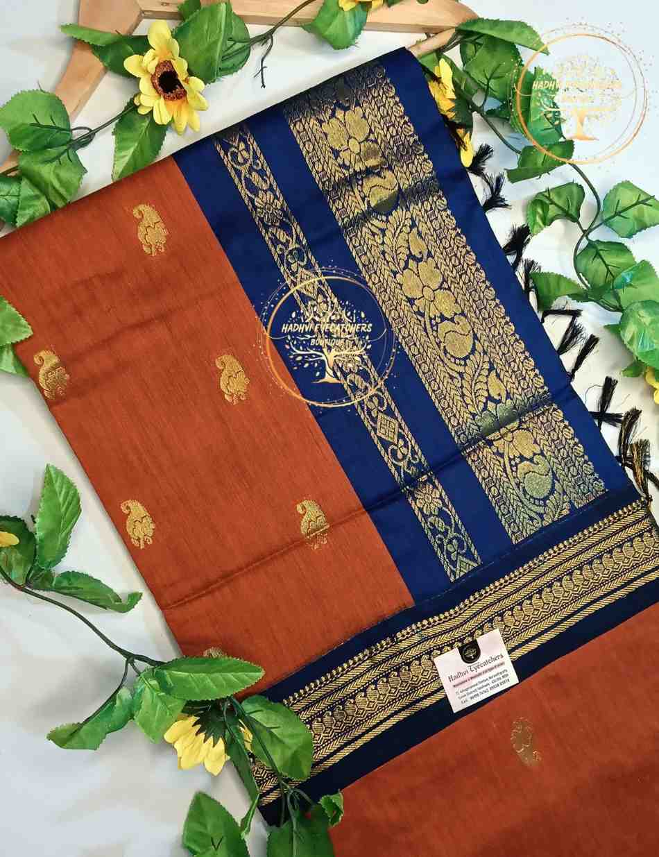 Elegant rust brown Kalyani cotton saree featuring a rich royal blue border adorned with traditional gold zari weaving. A perfect blend of earthy tones and classic South Indian craftsmanship.