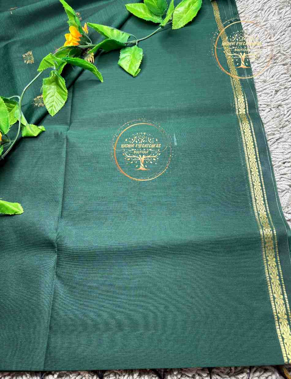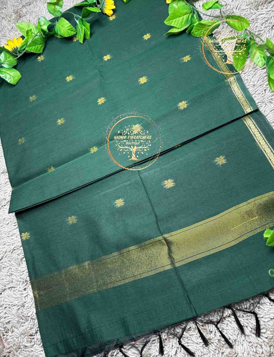 The saree is beautifully balanced with a bottle green contrast, enhanced by fine zari stripes that lend depth and richness to the design. A neatly woven gold zari border frames the saree, offering a classic finish without overwhelming the bright body shade.