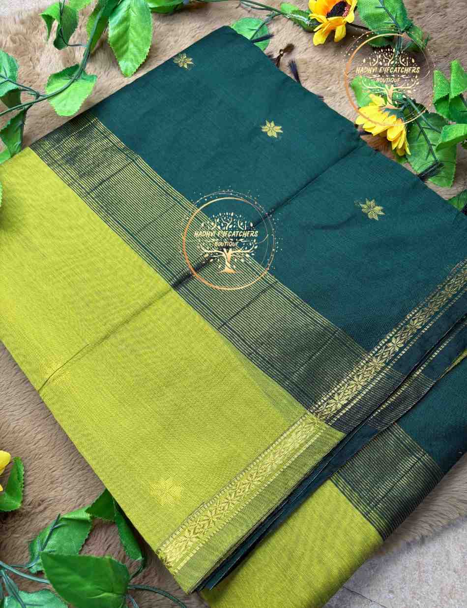 This Semi Maheswari silk cotton saree features a lively lemon yellow body that brings a fresh and cheerful tone to traditional wear. The body is subtly decorated with minimal gold zari motifs, adding a refined touch while maintaining a clean and graceful look.
