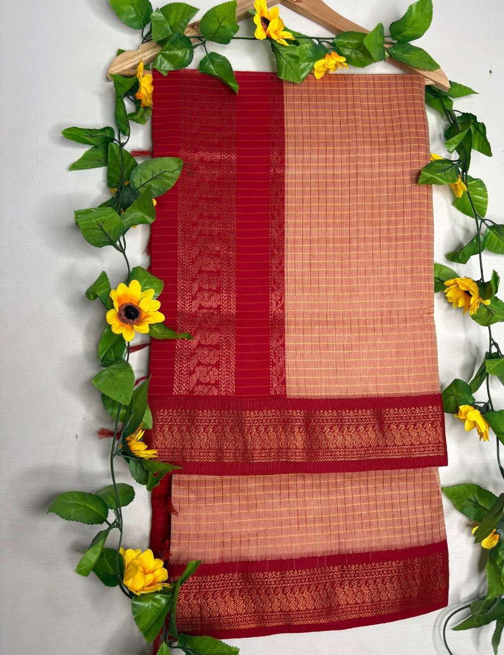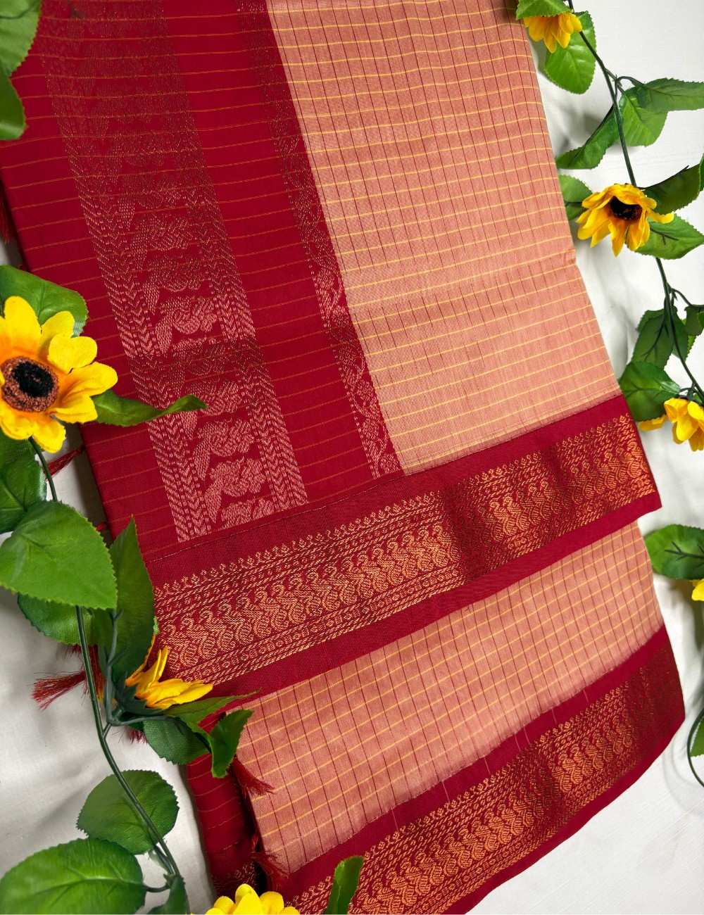 This saree glows with a soft peach and red checkered body, creating a warm, sunrise-inspired palette. The red border is richly woven with golden zari motifs — florals and paisleys that lend a celebratory finish. It’s a saree that feels both gentle and grand, ideal for morning rituals, festive brunches, and joyful gatherings.