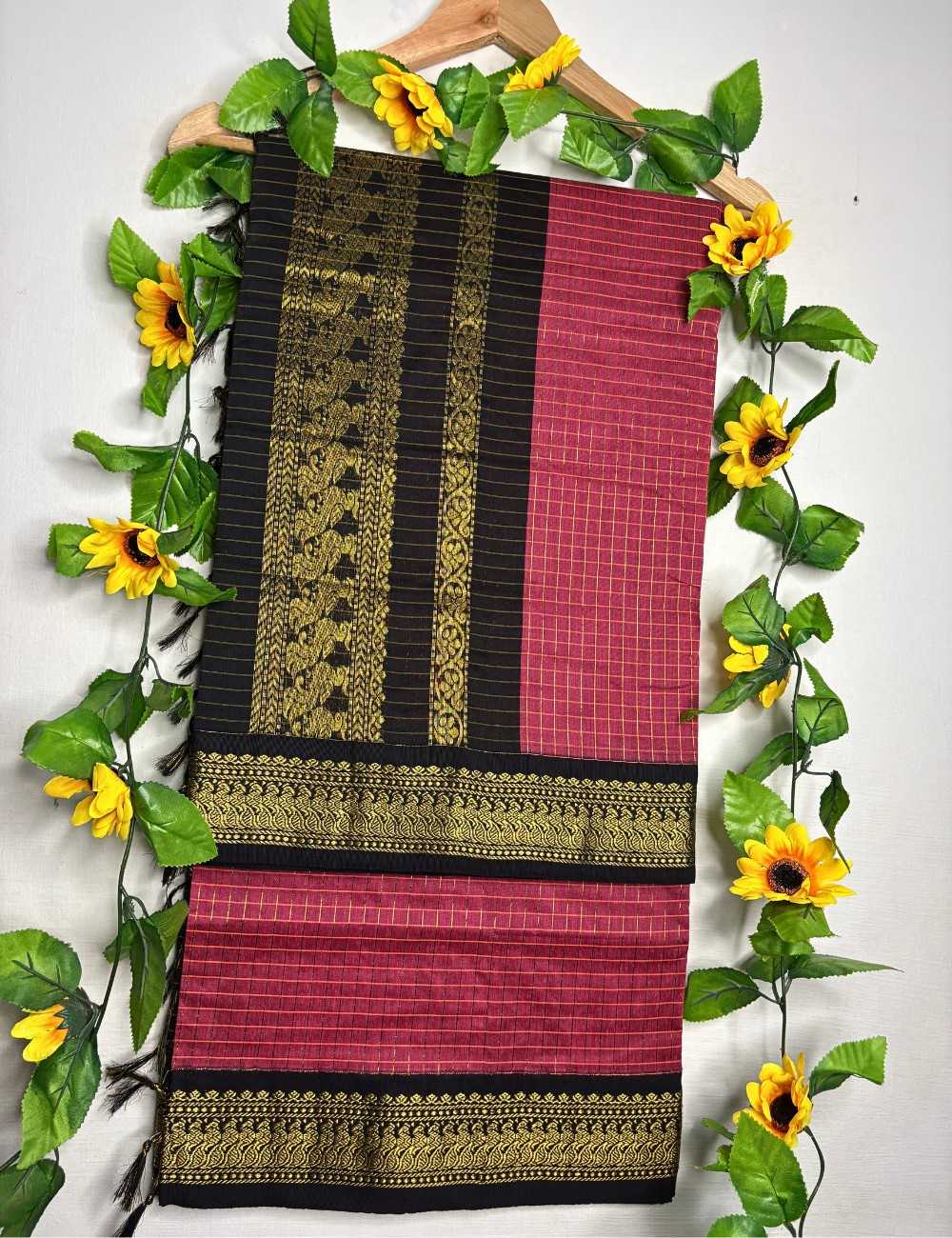 This saree is a vibrant expression of tradition, featuring a deep pink body with fine yellow grid checks. The black borders are richly woven with golden floral and geometric motifs, adding a regal touch to the design. The interplay of bold pink and intricate zari work makes this saree a festive favorite.