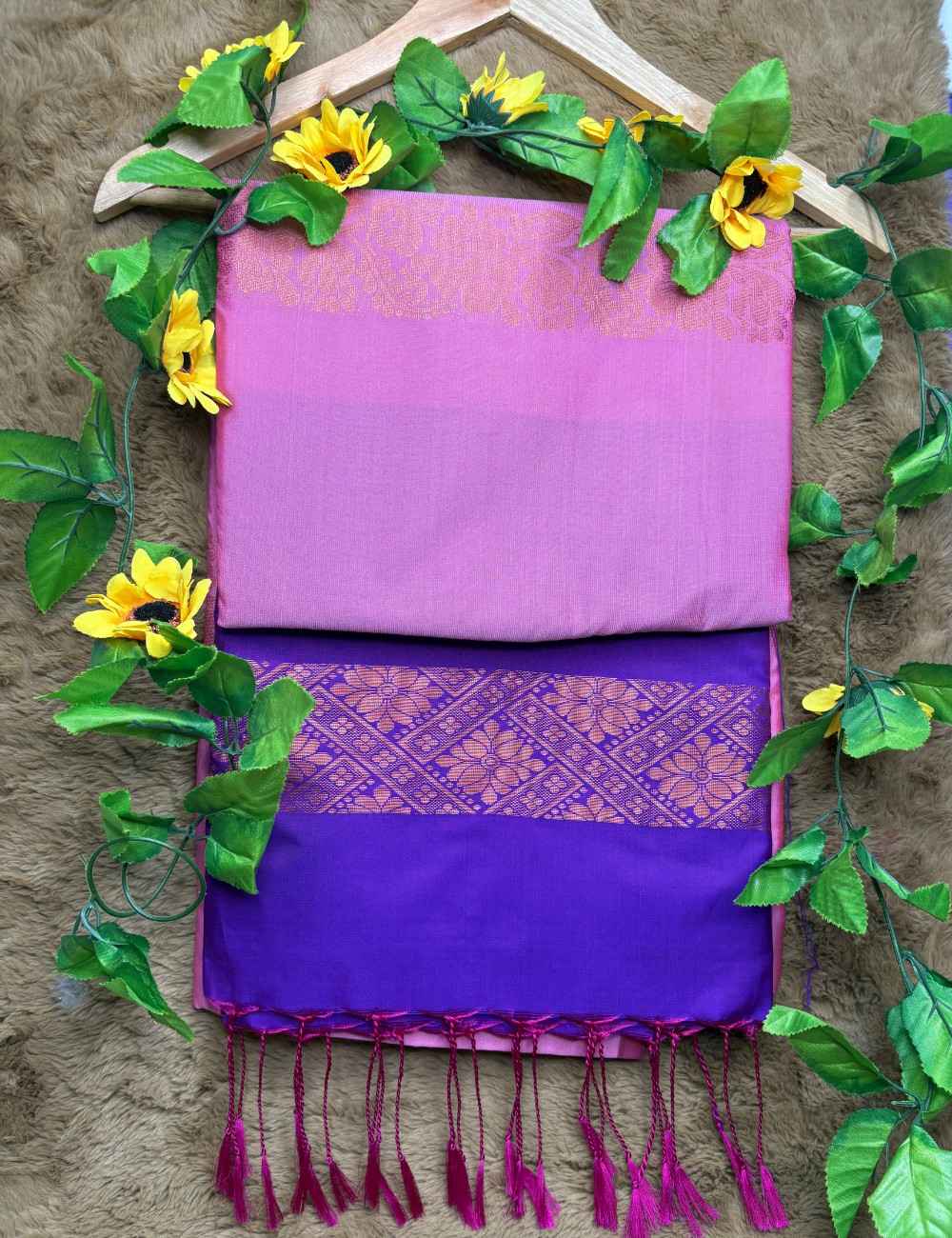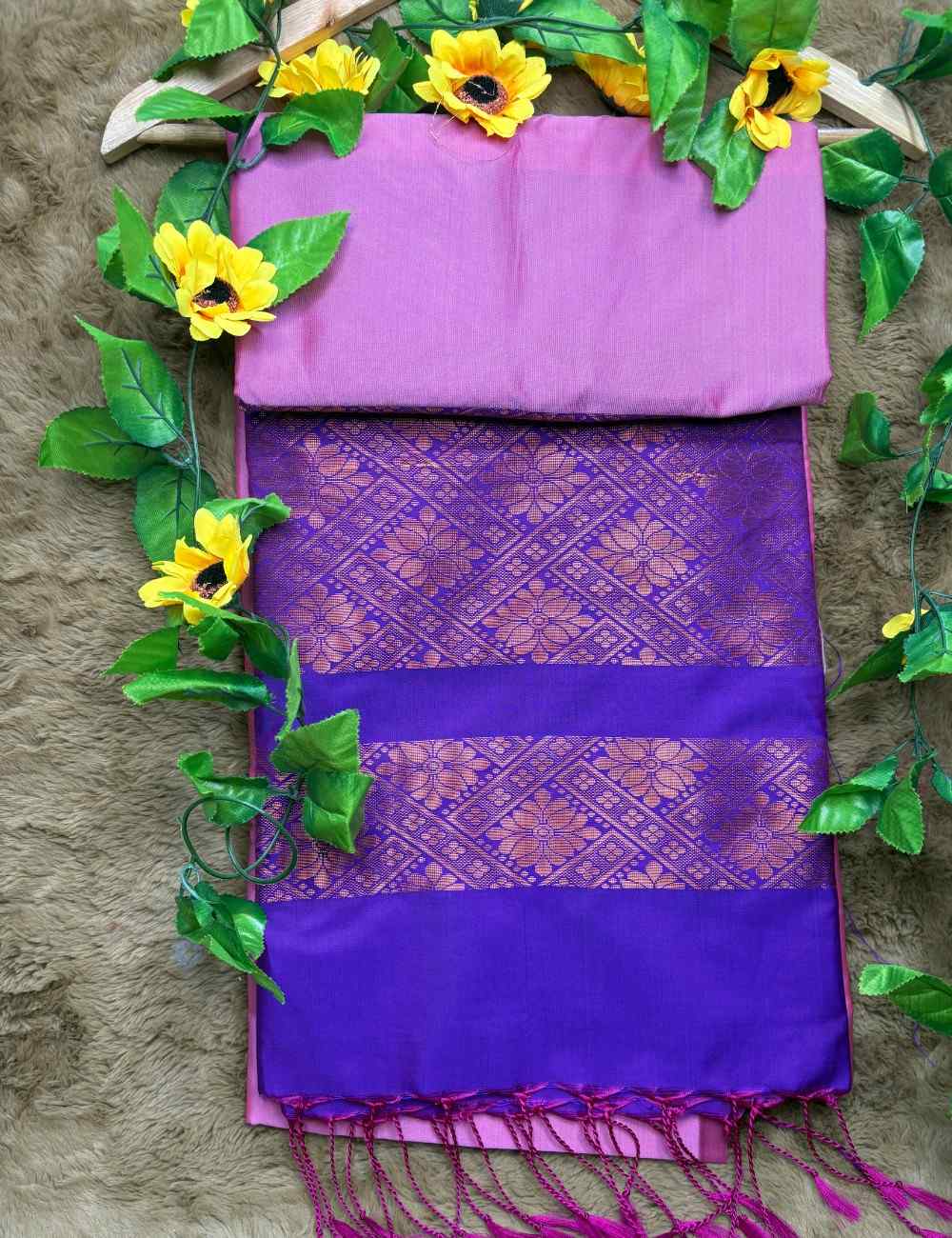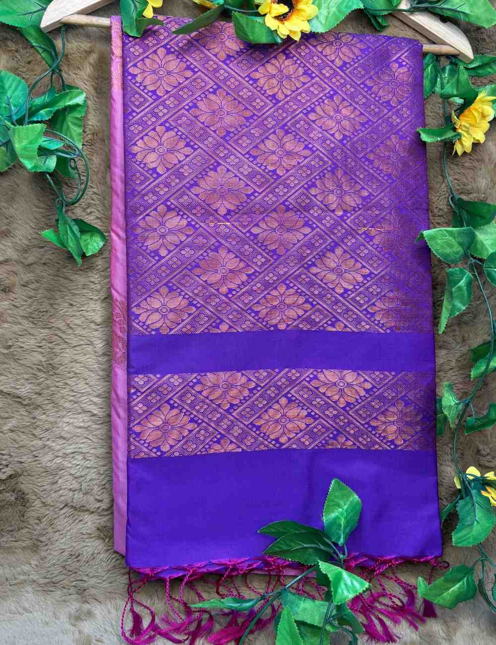 This saree celebrates feminine charm and regal depth. The pink body is adorned with subtle gold floral motifs that shimmer gently across the fabric. The purple pallu and blouse introduce a bold contrast, featuring elaborate gold zari patterns in floral and geometric forms.