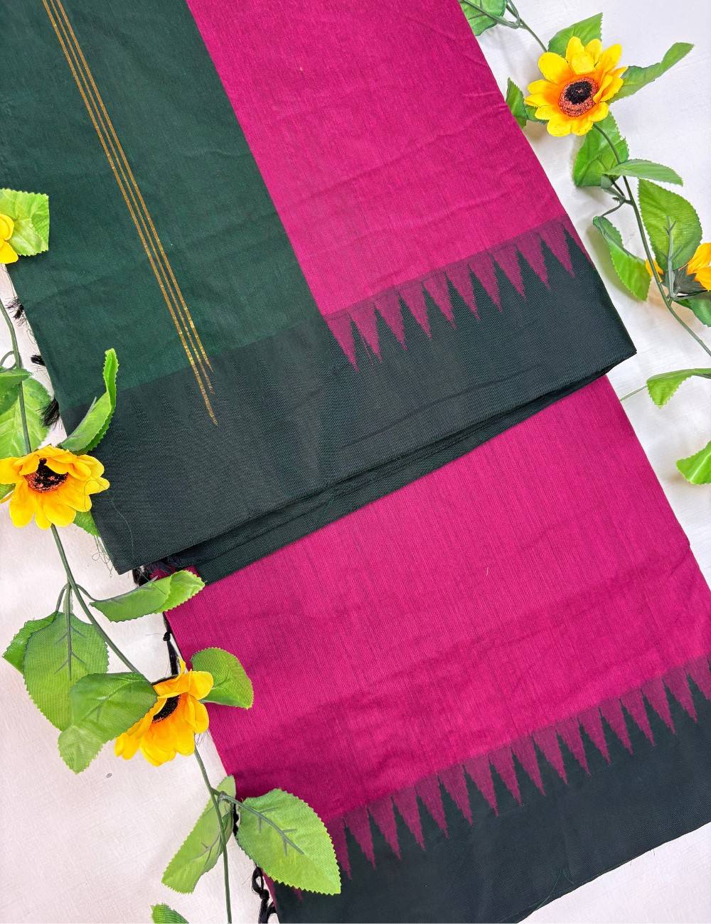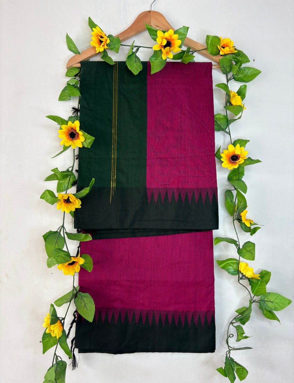 Be the first to review “Pooja -Majenta–Bottle Green Raga Kalyani Cotton Saree with Korvai Temple Border”