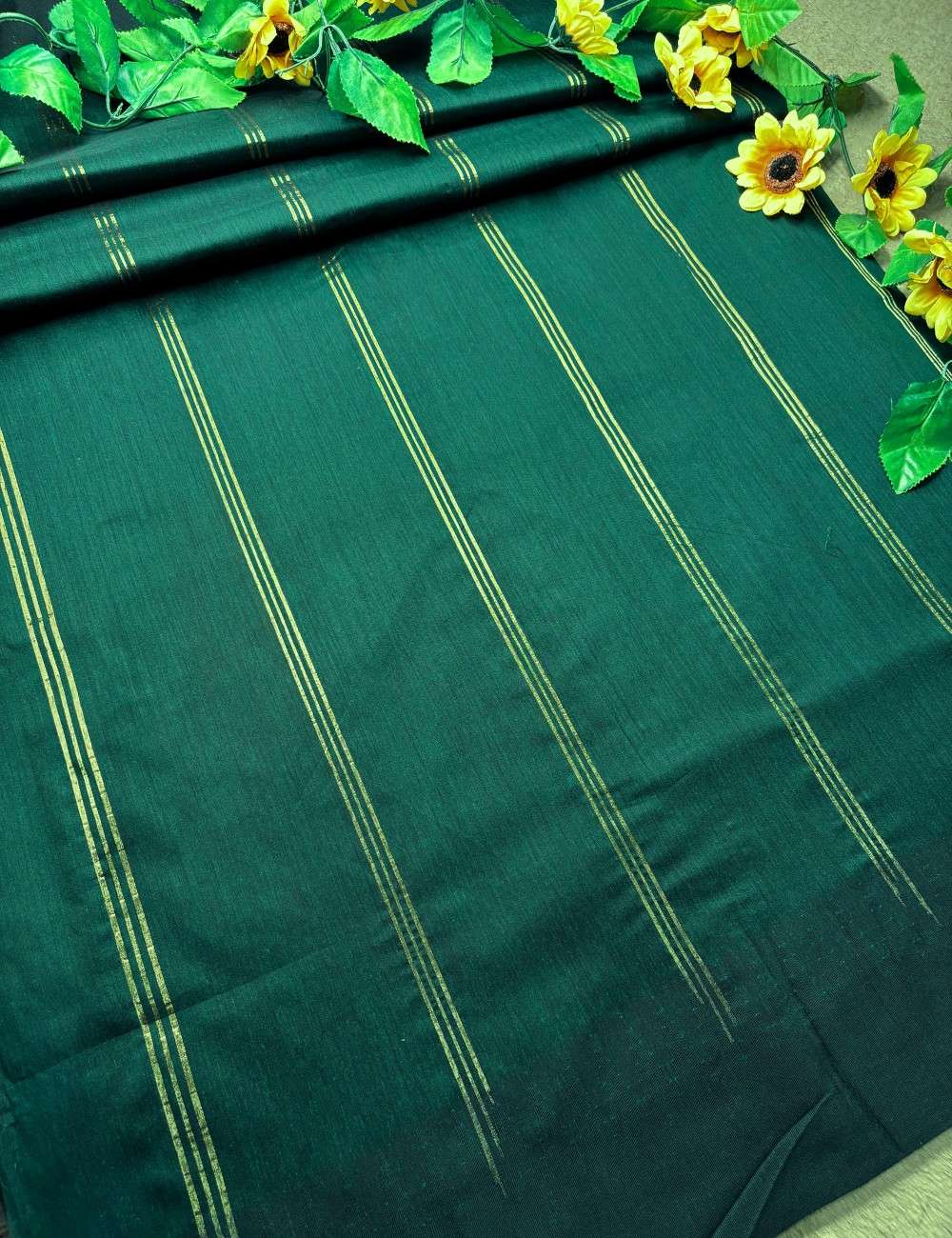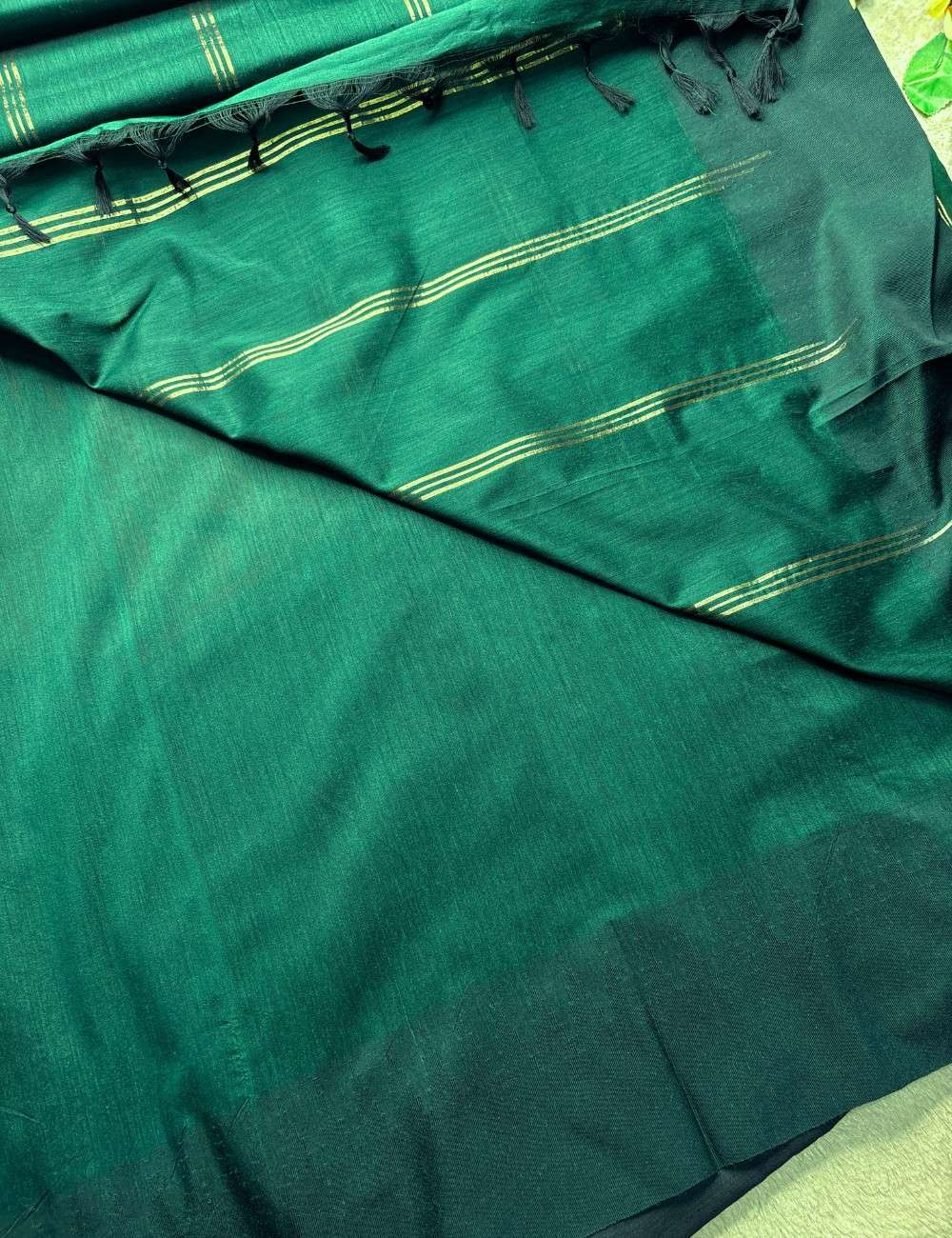 This elegant magenta and bottle-green saree is crafted from breathable Raga Kalyani cotton, offering a perfect balance of colour and comfort. The contrast panel highlights the richness of the weave, making the saree stand out effortlessly. Its crisp lines and soft finish make it a stylish addition to your wardrobe.
