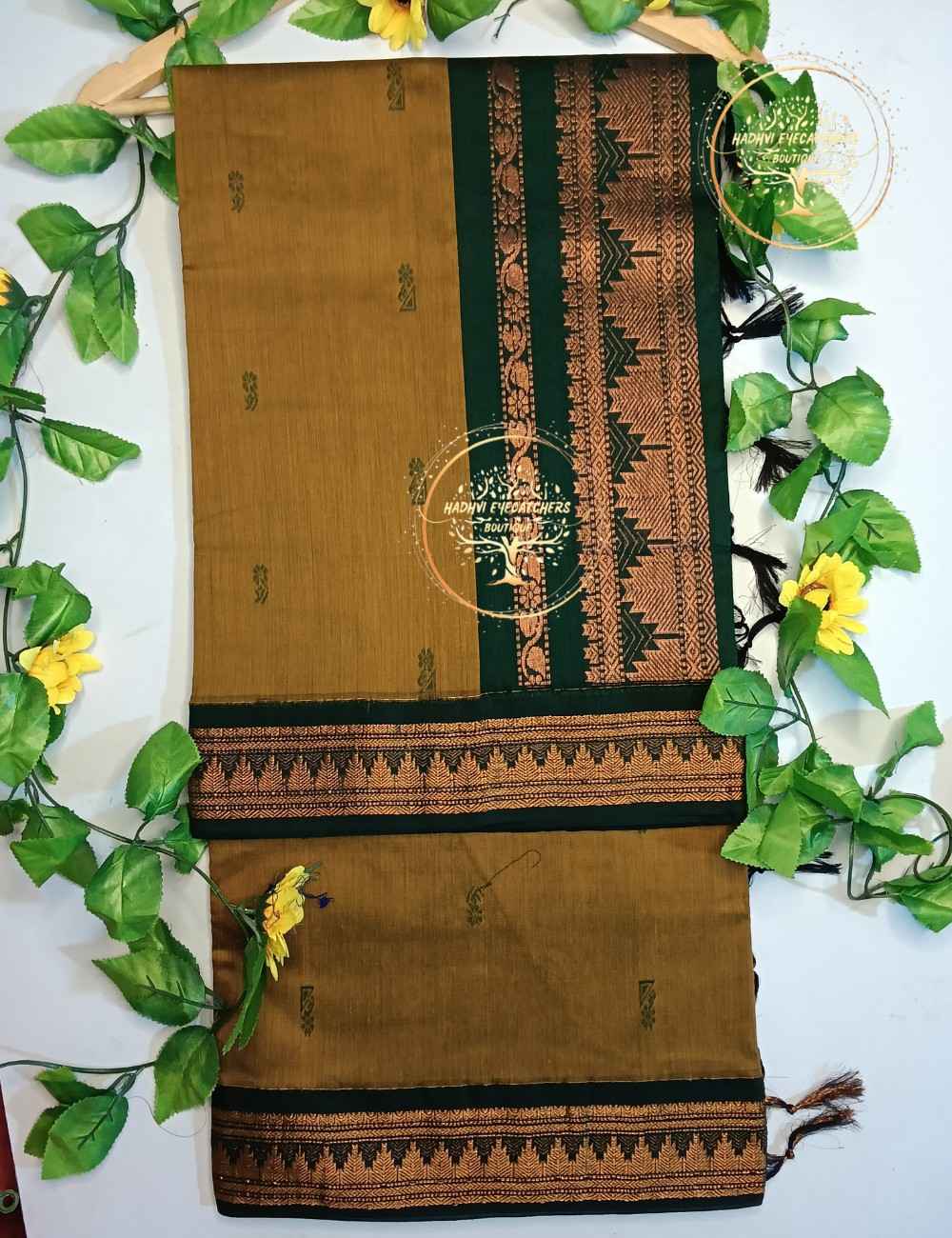 Add earthy elegance to your collection with this Kalyani Cotton Saree Mustard Brown with Bottle Green Copper Zari Border. The warm mustard brown body is adorned with minimal woven motifs that enhance its natural charm. A contrasting bottle green border with intricate copper zari weaving adds depth and a heritage-inspired finish. The matching pallu complements the border design, giving the saree a balanced and refined appearance. Made from premium Kalyani cotton, this saree offers excellent comfort, durability, and graceful drape.