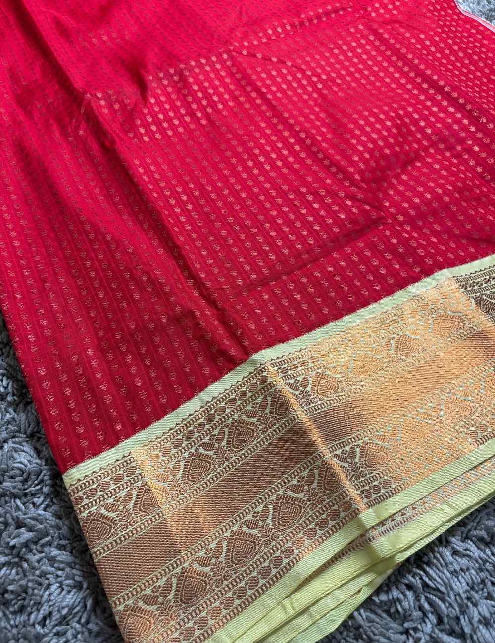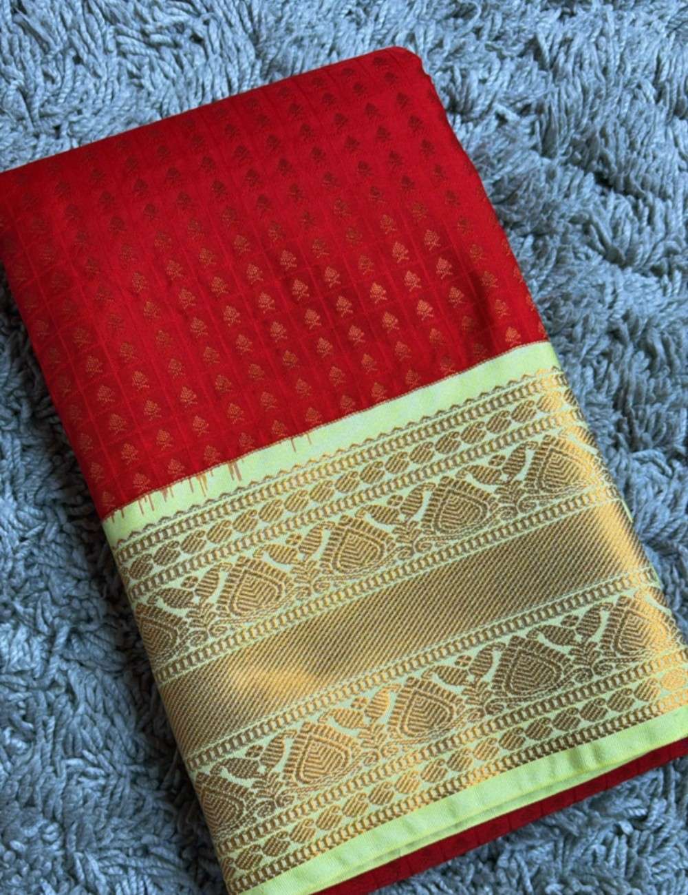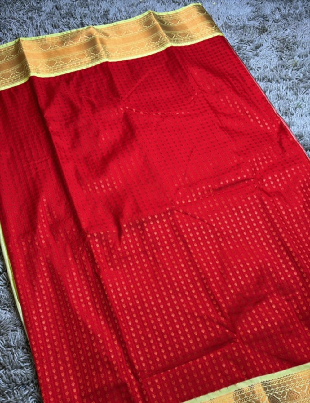 This Lakshadeepam saree features a bold red body enriched with gold buttas arranged in vertical lines. The Semi Kanchi Silk weave enhances the depth and sheen of the motifs, giving the saree a luxurious finish.