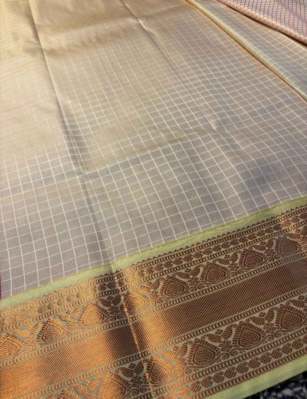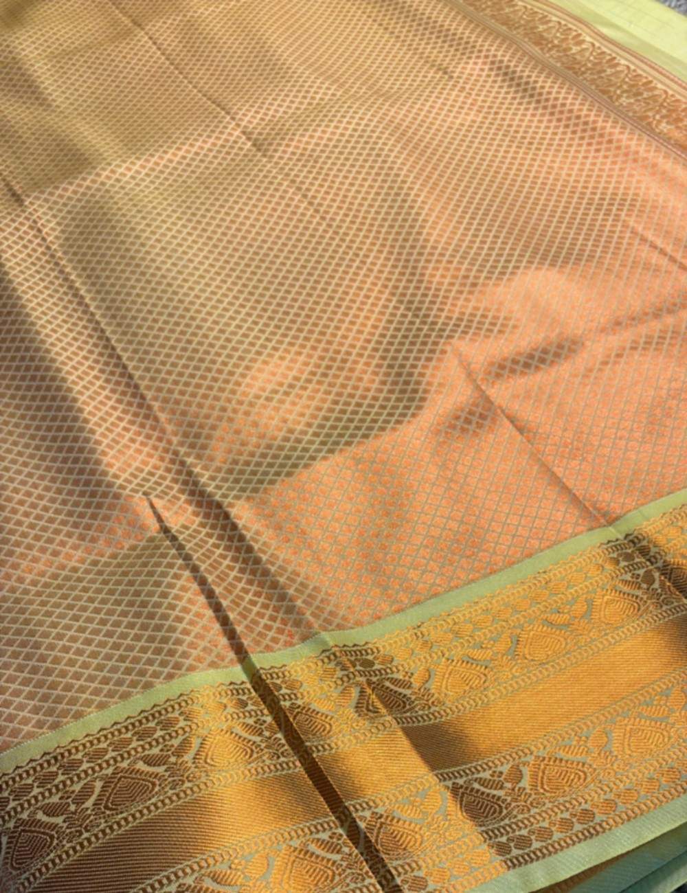 The cream pallu and blouse soften the vibrant body shade, enriched with floral and paisley gold zari work. A cream border with traditional gold detailing frames the saree gracefully, making it perfect for festive and ceremonial wear.