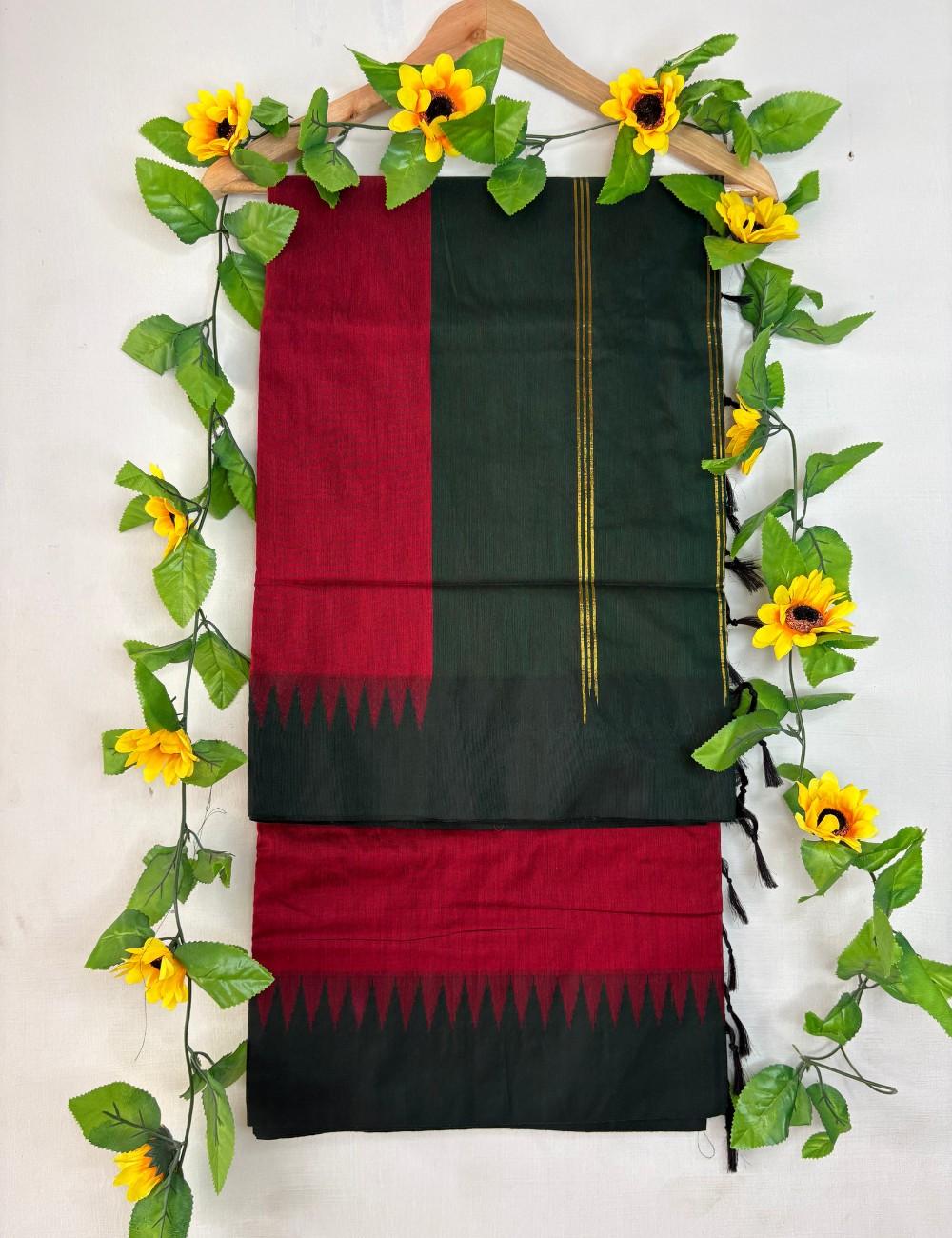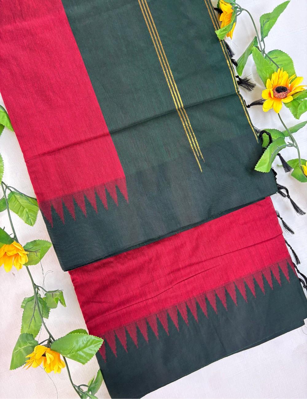 A rich red pallu flows into a dark green body, unified by a jagged korvai temple border in black. Vertical golden stripes on the green section add elegance, while the chit pallu completes the traditional narrative. Ideal for women who appreciate bold color with classic craftsmanship, this saree balances comfort and heritage beautifully.