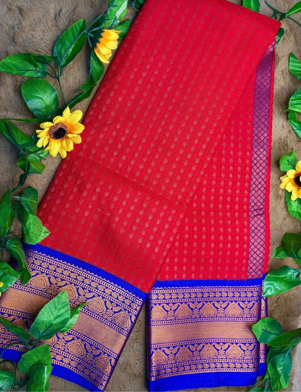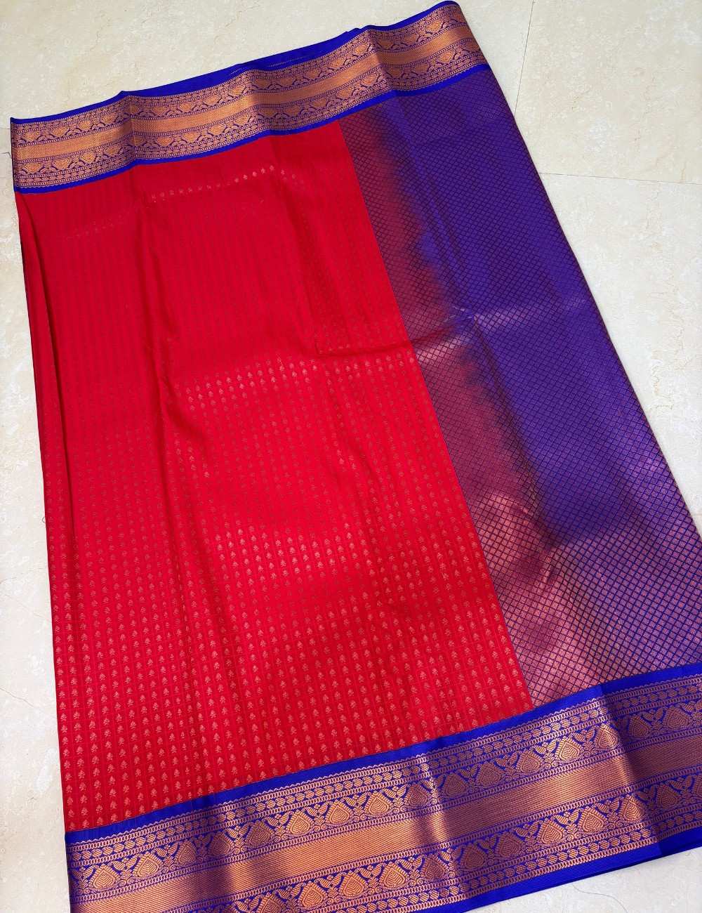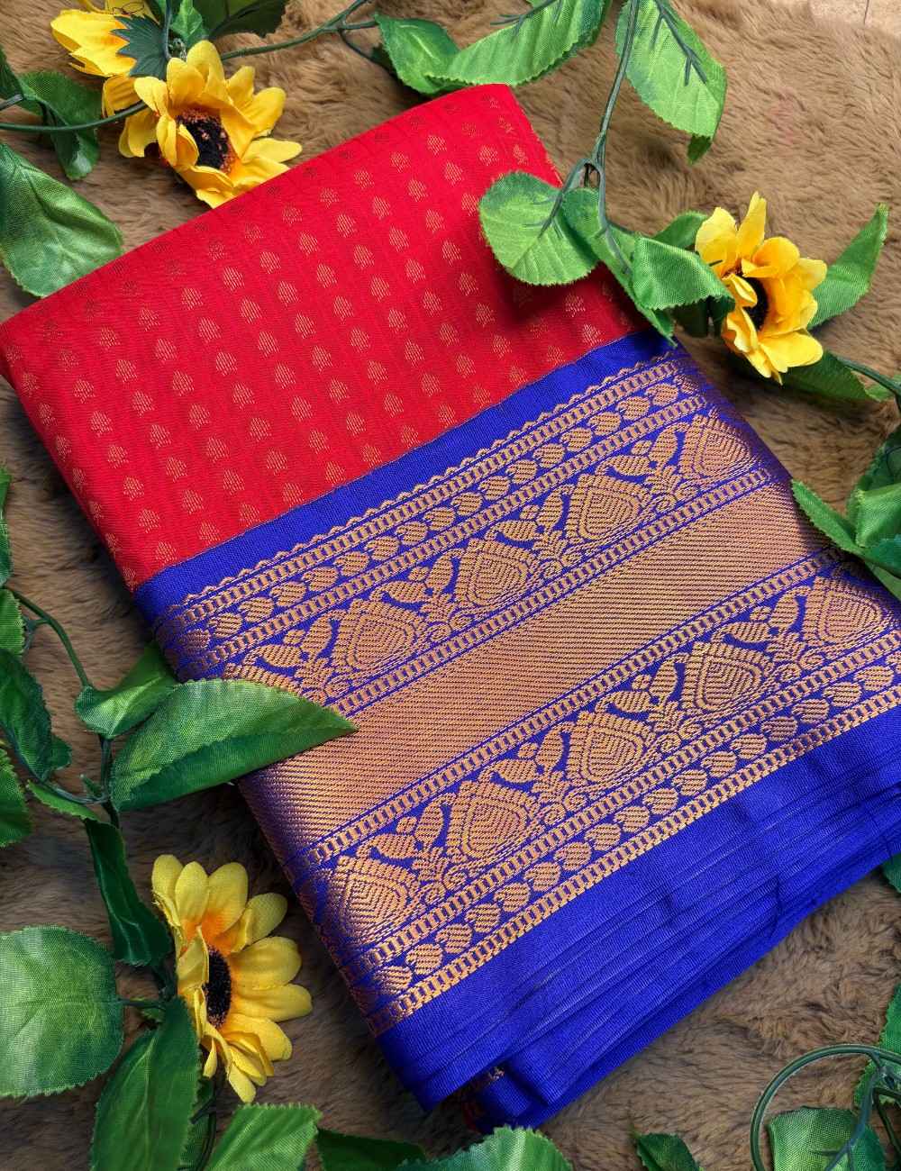 This saree features a red body with golden buttas and a royal blue lower half. The gold zari border adds richness and contrast. A striking drape for festive occasions.