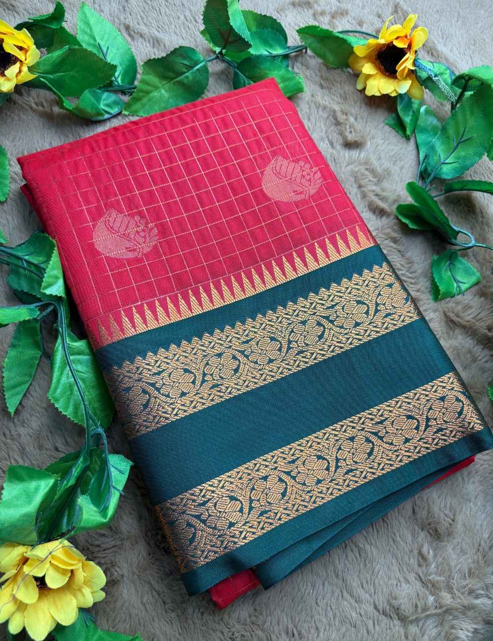 This striking vegan Kanchipuram saree blends traditional elegance with sustainable craftsmanship. The red body features a subtle grid layout inspired by the Vaira Oosi checks pattern, adorned with embroidered mango-shaped motifs that symbolize prosperity and grace.