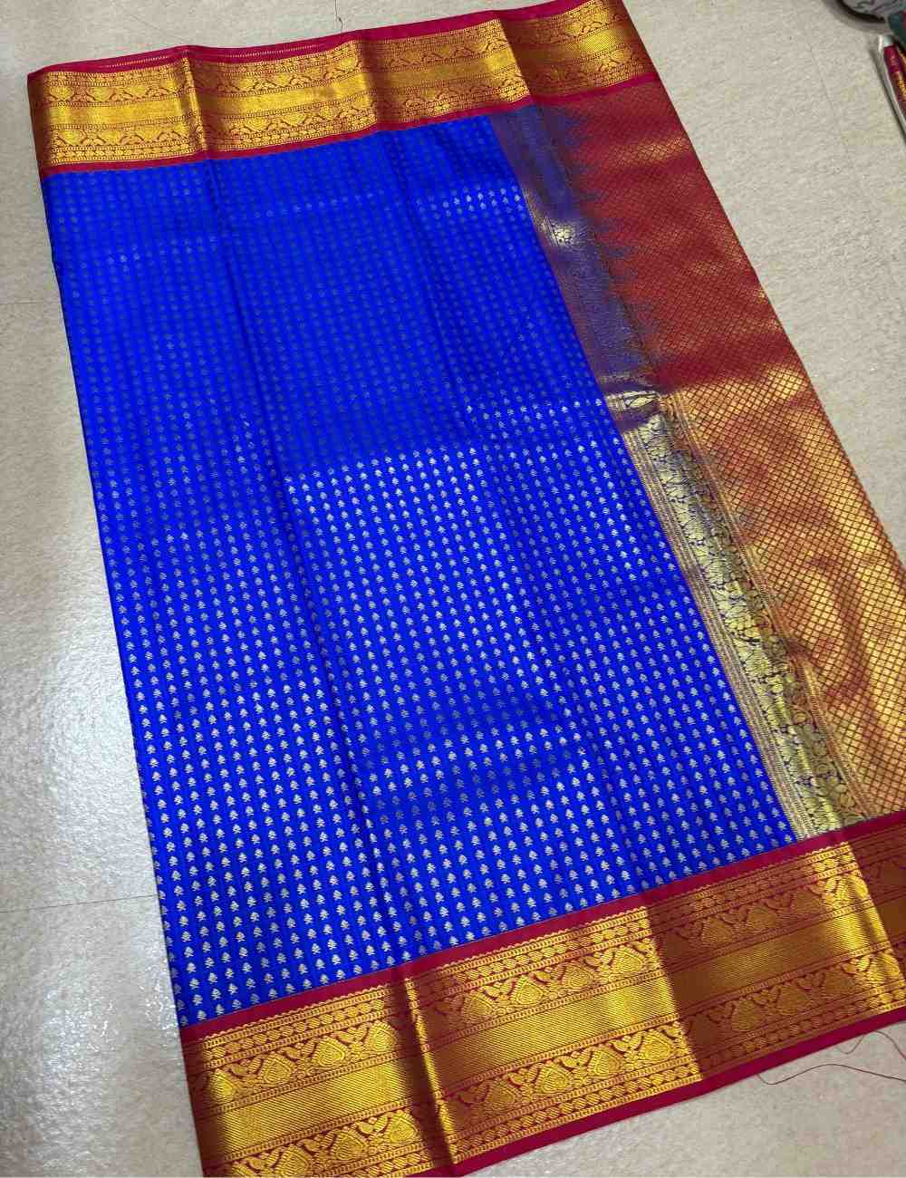 This Lakshadeepam saree features a rich royal blue body adorned with 1000 golden buttas arranged in a grid. The Semi Kanchi weave enhances the depth and brilliance of the motifs, giving the saree a regal finish.