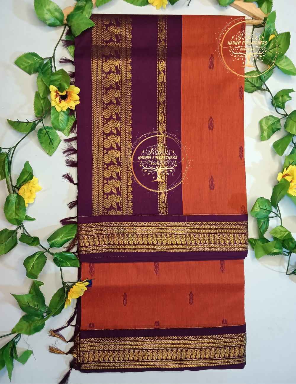 Bold yet traditional, this Rust Orange Kalyani Cotton Saree is a statement piece rooted in heritage aesthetics. The warm rust-orange body contrasts beautifully with the deep purple border woven in gold zari, creating a striking and festive appearance.