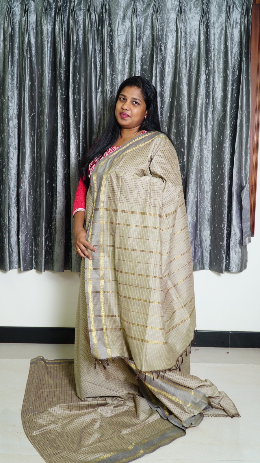 This understated Arani Muthukattam saree features a serene mist beige body with subtle woven texture and a refined light grey-gold border. Crafted from 100% acrylic cotton, it offers the comfort of cotton with enhanced durability — no shrinkage, no color fading, and easy maintenance.