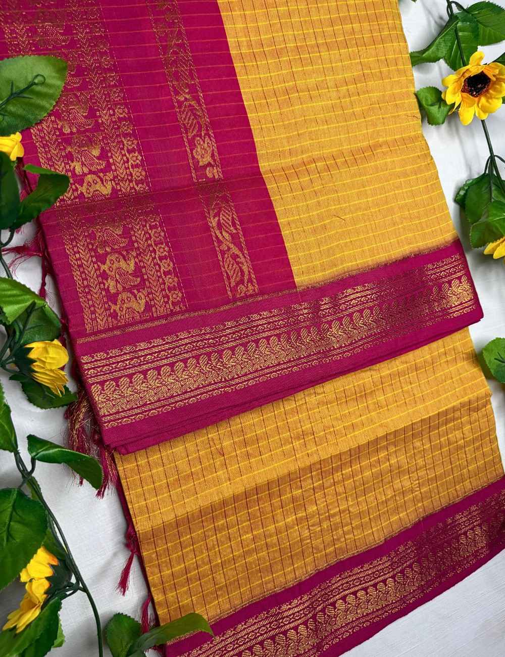 Celebrate timeless elegance with this vibrant handloom saree. The mustard yellow body is woven with delicate grid checks that lend subtle texture and structure to the warm base. Contrasting bright pink borders and pallu bring a festive pop of color, richly embellished with golden zari motifs inspired by traditional floral and paisley designs.
