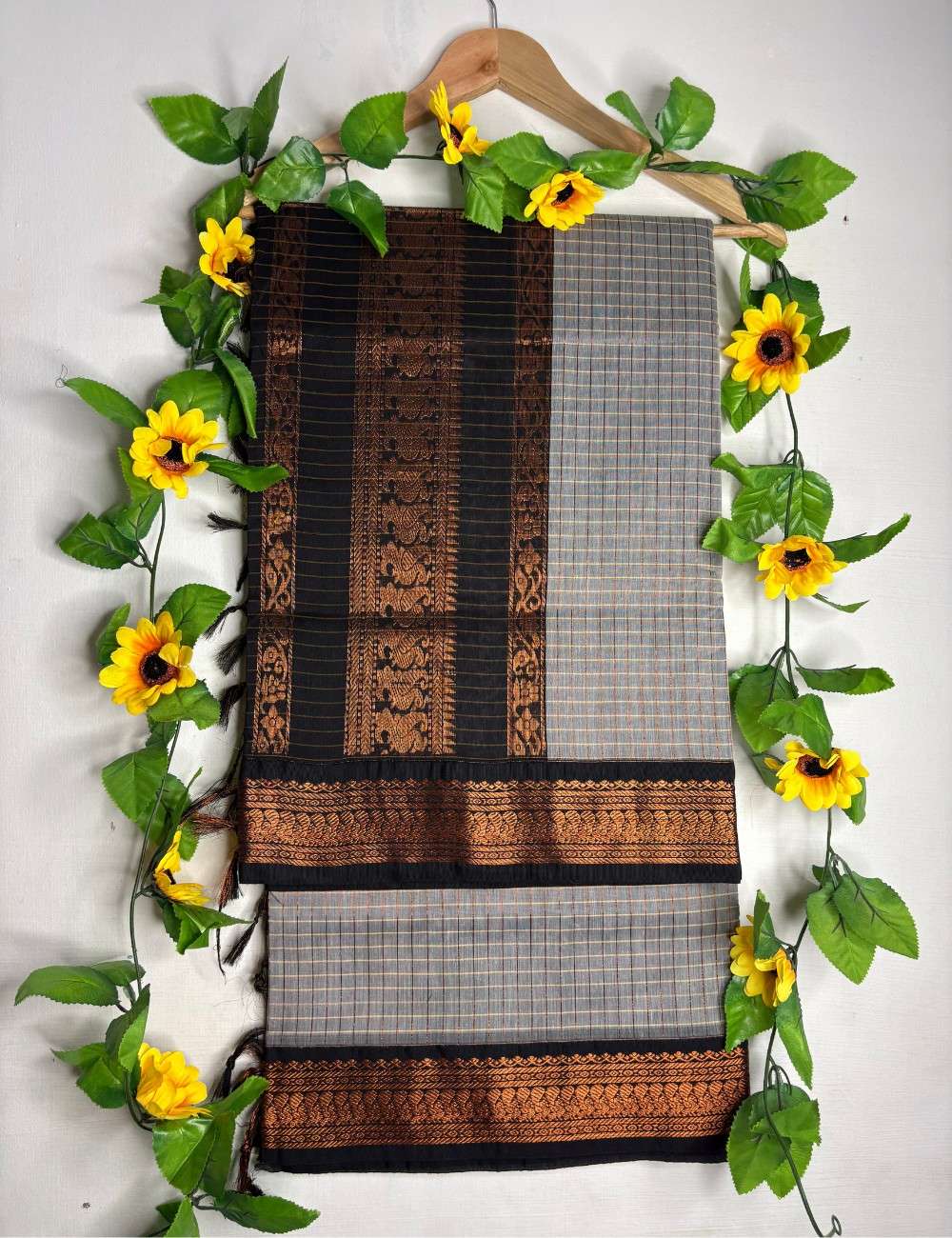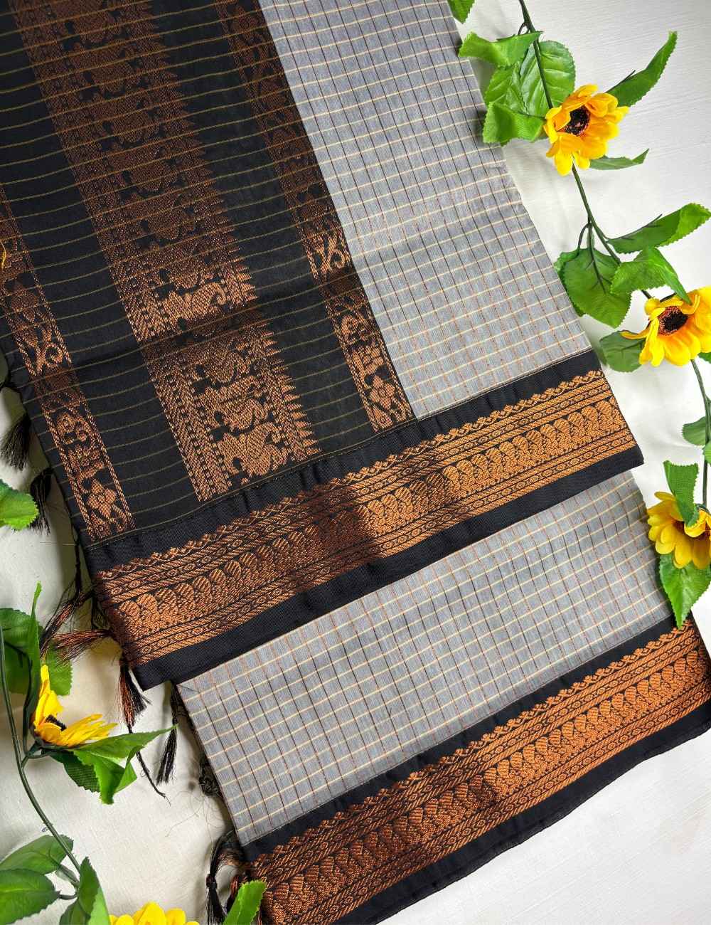 The black border, richly detailed with copper zari florals and paisleys, frames the saree with striking contrast. The interplay of silver grey and copper accents adds depth and timeless charm, ensuring the drape feels both classic and contemporary. Paired with a matching black blouse, this saree is a refined choice for women who appreciate subtle elegance elevated by artisanal craftsmanship.