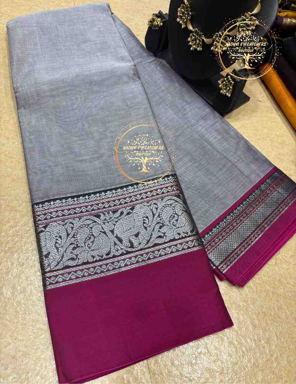 This Narayanpet cotton saree reflects simplicity combined with traditional elegance. The steel grey body offers a calm and sophisticated appearance. A finely woven silver zari border runs along the saree, adding a touch of heritage charm.
