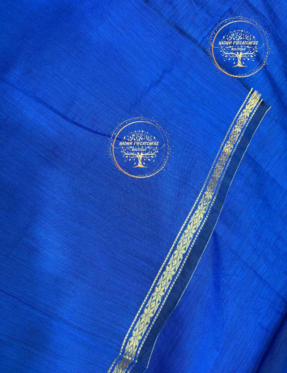 The saree transitions beautifully into a royal blue contrast pallu, highlighted with fine zari woven lines that create a graceful visual balance. A coordinated gold zari border frames the saree, enhancing its overall appeal without overpowering the color combination.