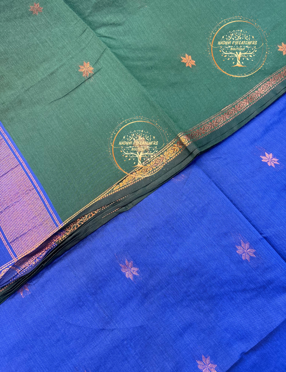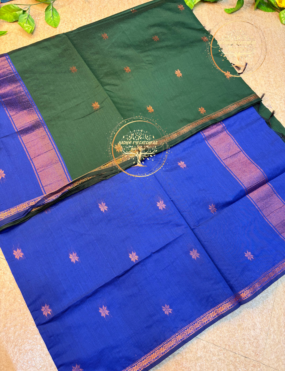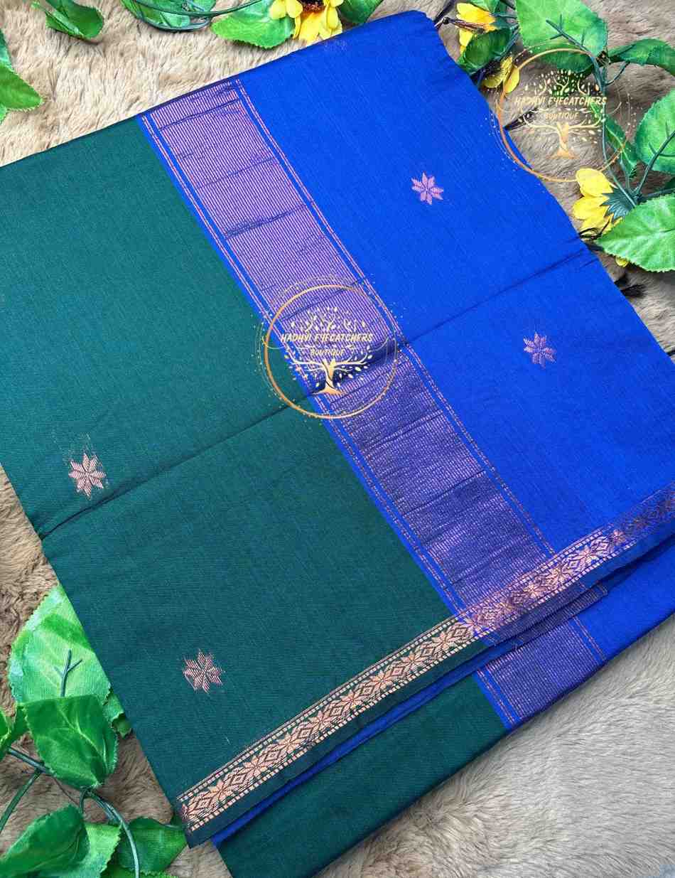 This Semi Maheswari silk cotton saree features a deep bottle green body that brings a sense of richness and timeless elegance. The body is subtly embellished with small gold zari buttas, adding just the right amount of traditional charm.