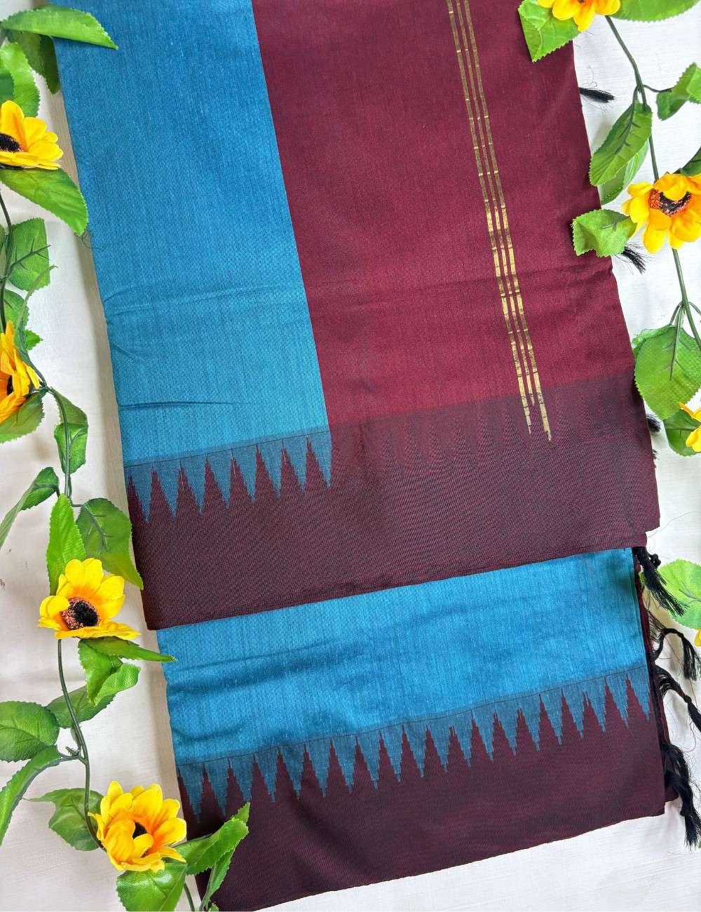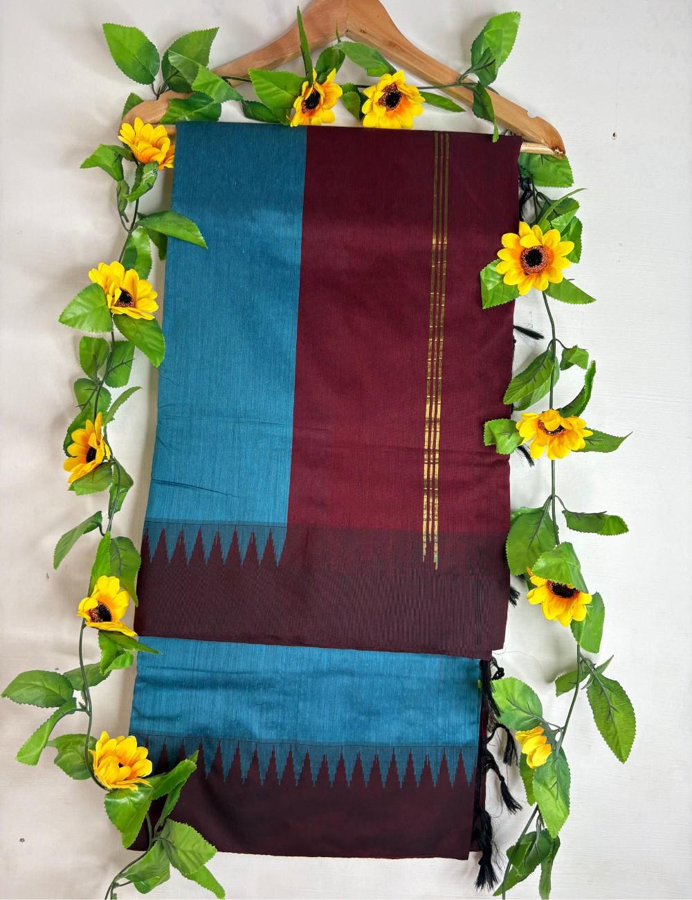 This saree blends jewel tones with heritage detailing. The teal body offers vibrancy and freshness, while the maroon korvai temple border provides architectural precision. The triangular border motifs echo temple gopurams, adding depth and tradition. Golden stripes shimmer across the pallu, enhancing its festive appeal without overpowering the design.