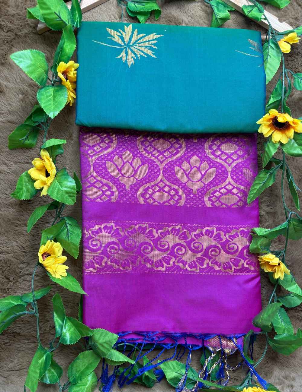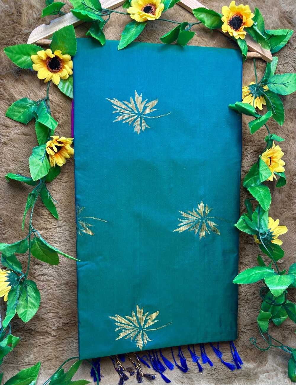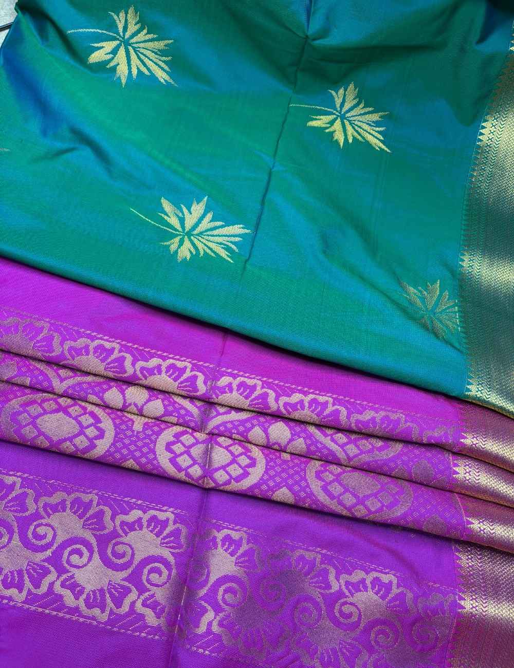 This saree celebrates vibrant color play and ornate craftsmanship. The teal body glows with golden leaf motifs, adding texture and warmth. The magenta pallu and blouse introduce a striking contrast, showcasing elaborate floral and geometric zari work framed by zigzag and triangular borders.