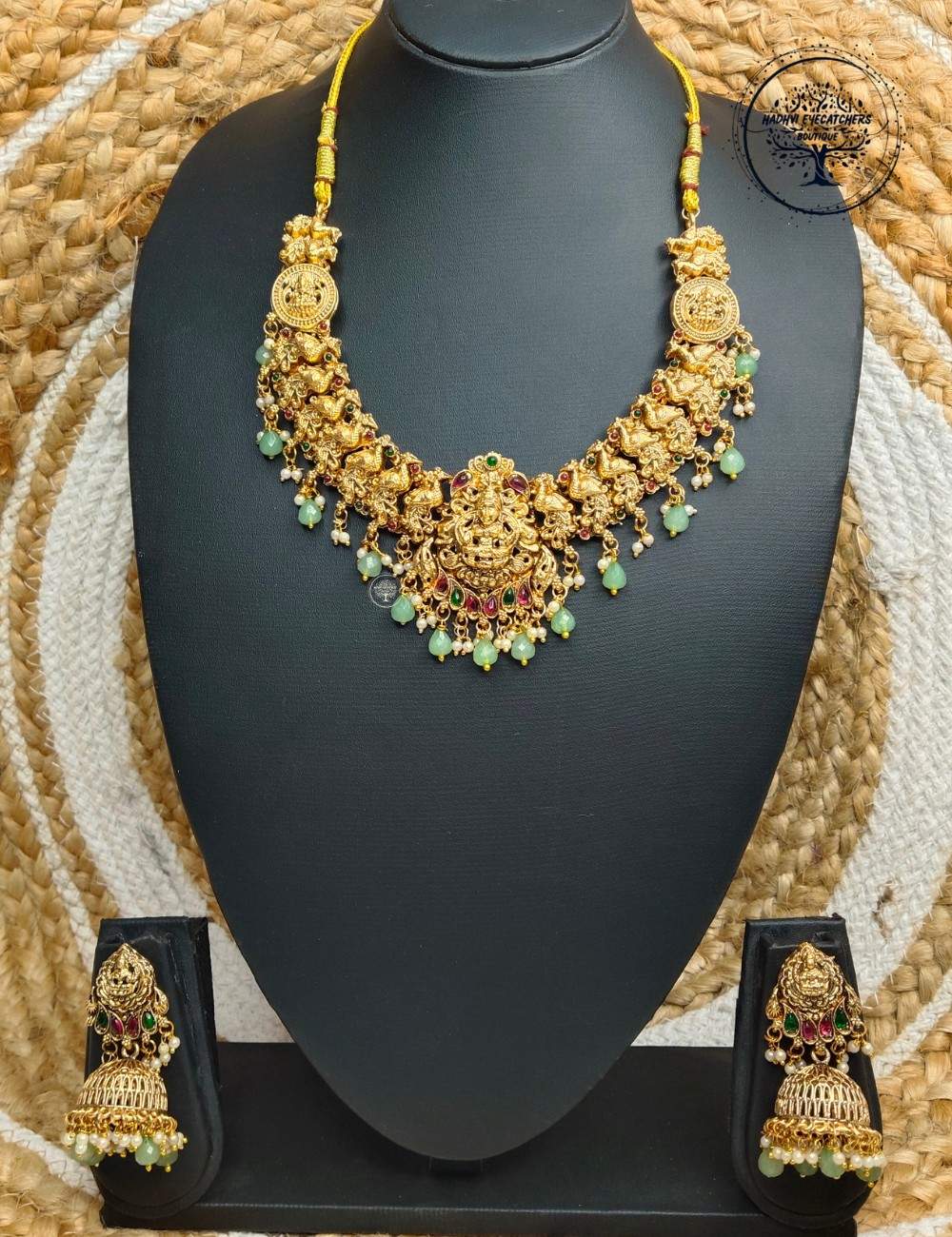 Enhance your ethnic elegance with this beautifully crafted temple-style imitation jewelry set, inspired by timeless South Indian heritage designs. Each piece reflects intricate artistry, featuring divine goddess motifs, coin detailing, and rich antique gold polish that closely resembles traditional gold jewellery.