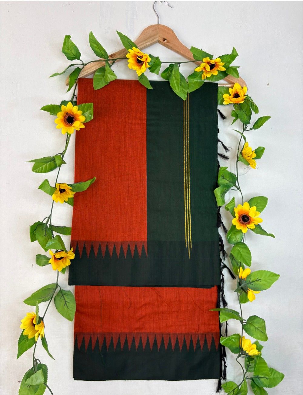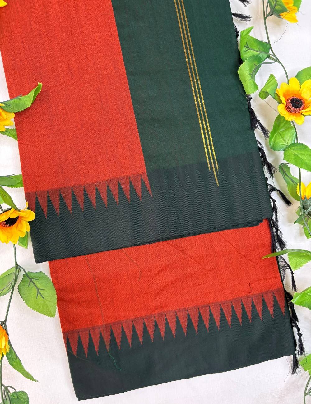 This saree is a radiant blend of warmth and tradition. The terracotta pallu evokes the richness of clay and celebration, while the dark green body offers grounding contrast. A crisp black korvai temple border in triangular motifs bridges the two tones with architectural rhythm, inspired by South Indian temple silhouettes. The green section features fine vertical golden lines that shimmer subtly, adding depth and refinement. Tassel detailing along the edges enhances the handcrafted feel, giving the saree a festive finish.