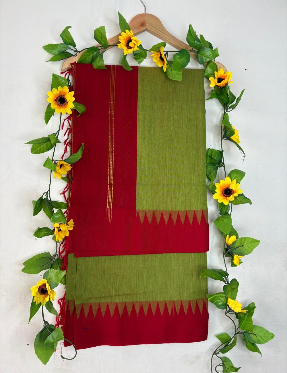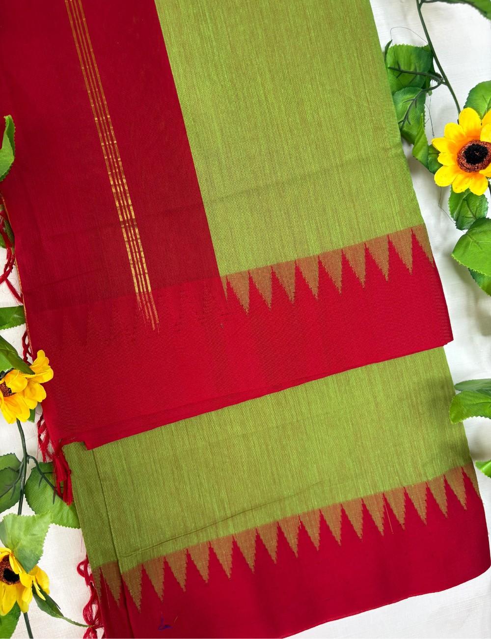 A textured green body paired with red temple border. Zigzag motifs and golden stripes add festive elegance.Handwoven in Raga Kalyani cotton with korvai temple border and chit pallu — breathable, structured, and perfect for office wear, casual outings, or cultural gatherings.