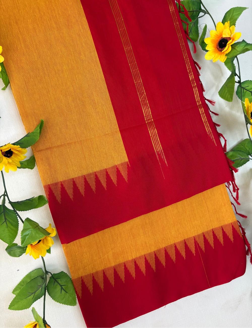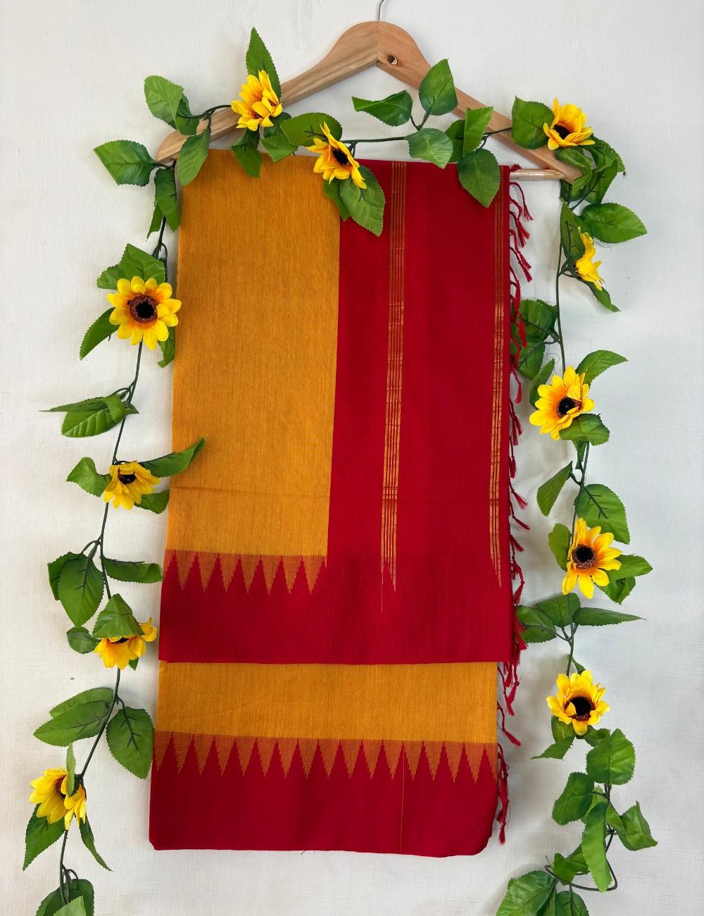 A textured mustard body paired with red temple border. Zigzag motifs and golden stripes add rustic festive charm. Handwoven in Raga Kalyani cotton with korvai temple border and chit pallu — breathable, structured, and ideal for festive wear, office use, or cultural gatherings.