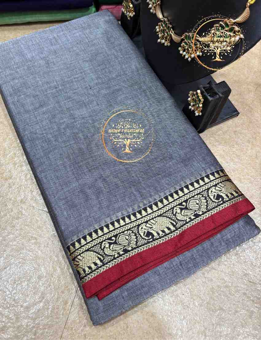 This authentic Narayanpet cotton small elephant border saree showcases the timeless weaving heritage of Telangana. The saree features a beautifully woven solid body complemented by a classic elephant motif border that symbolizes tradition and elegance. Crafted from pure cotton, it is lightweight, breathable, and ideal for long hours of comfortable wear. The soft texture allows easy draping while maintaining a neat and graceful fall. The subtle contrast border enhances the overall look without overpowering the simplicity of the saree. Each saree comes in a unique and carefully selected color combination.