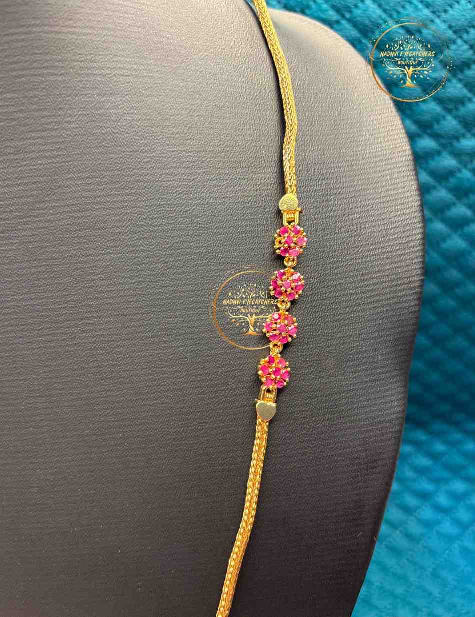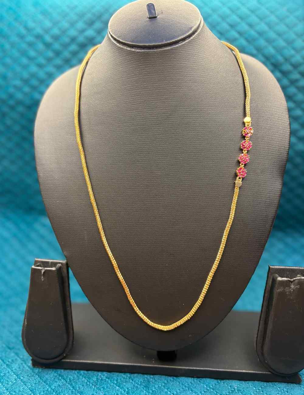 Our signature 24-inch Moppu Long Chain is a masterpiece of imitation jewelry, blending traditional craftsmanship with a high-quality micro-gold plating for a lasting shine. The elegant side pendant, or Mugappu, is intricately designed to sit gracefully just below the neck, providing a sophisticated look that pairs perfectly with sarees and ethnic ensembles. Crafted from premium, non-allergic base metals, this necklace is meticulously tested to be skin-friendly, ensuring you can celebrate your special moments in comfort and style.