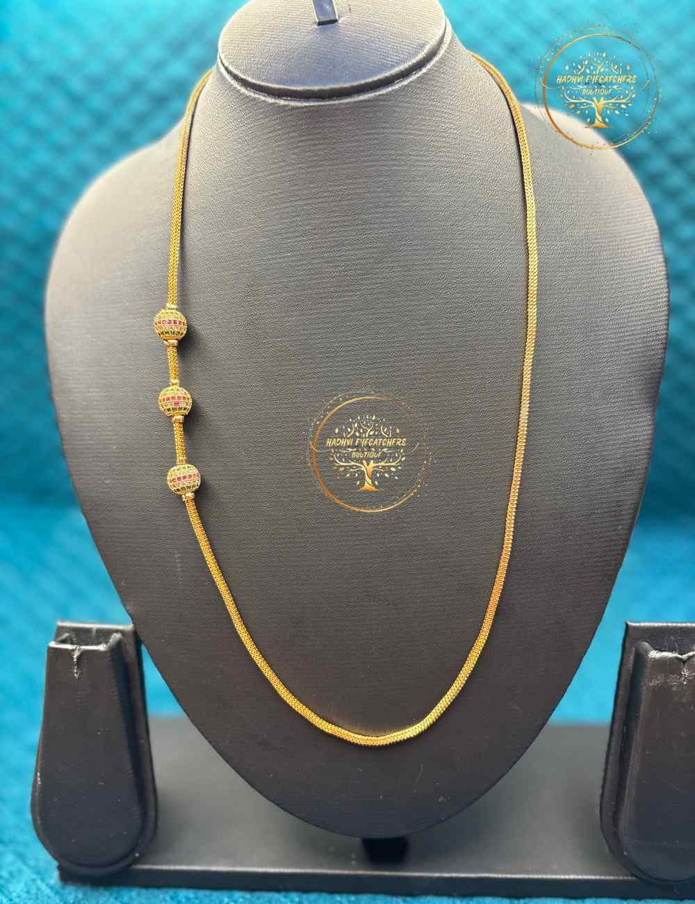 Adorn yourself with this timeless 24-inch imitation long chain, featuring an exquisitely crafted Moppu (side pendant) that adds a touch of traditional South Indian grace to any outfit. This lightweight, skin-friendly neck chain is designed to mimic the luxurious luster of real gold, making it the perfect statement piece for weddings and festive celebrations.