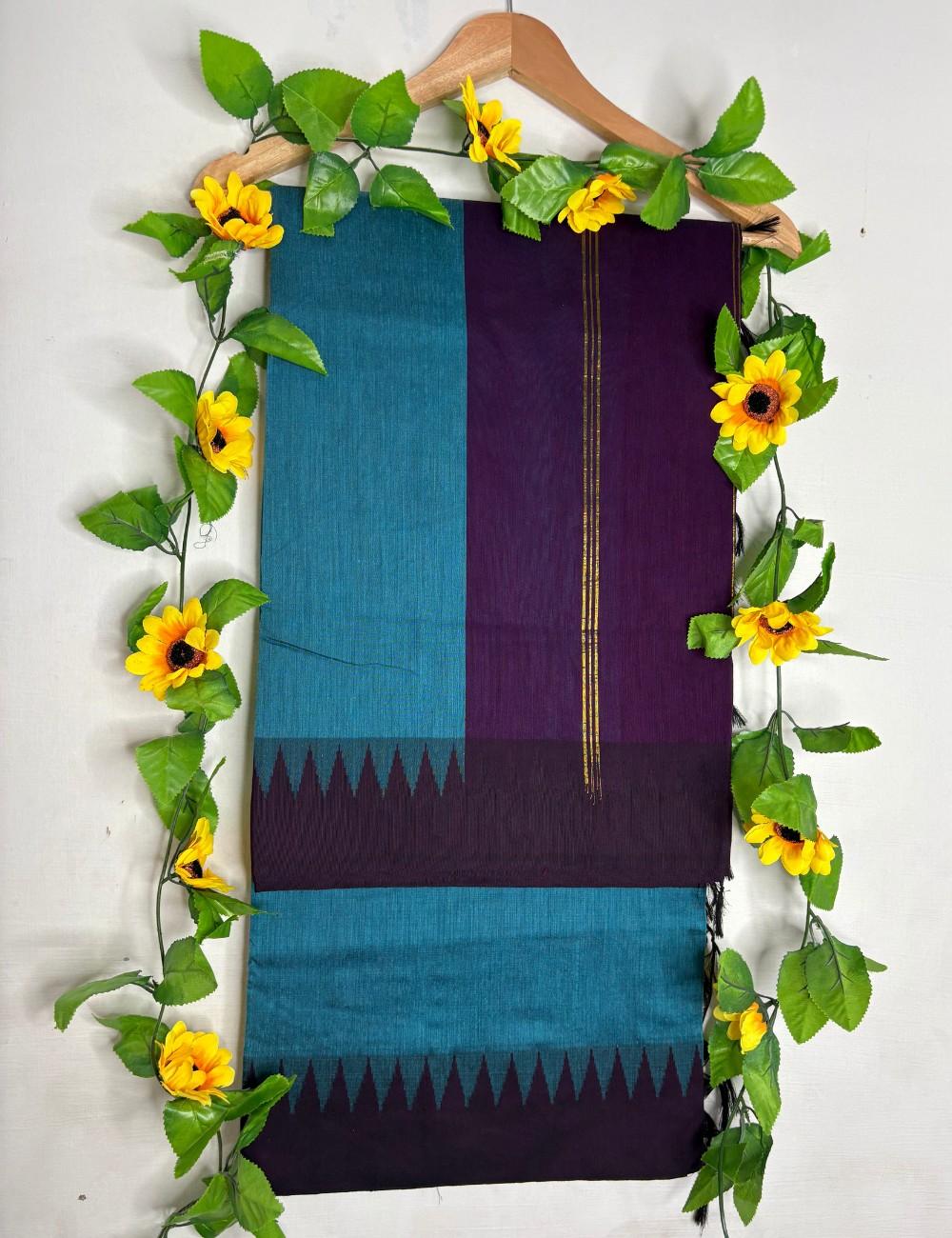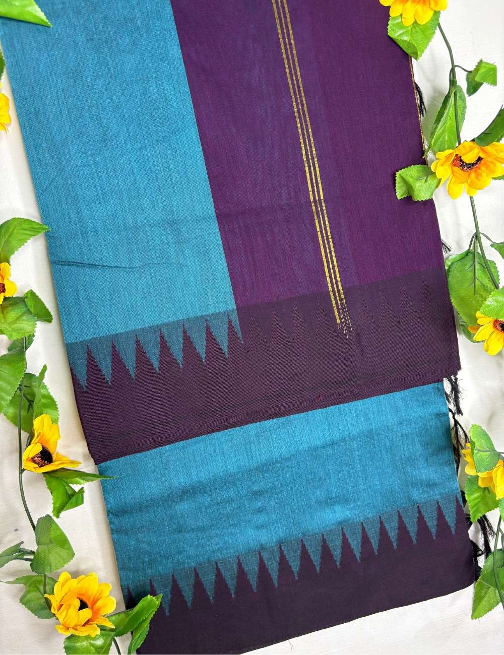 A turquoise blue body paired with deep purple temple border. Zigzag motifs and golden stripes add vibrant festive charm.Handwoven in Raga Kalyani cotton with korvai temple border and chit pallu — breathable, structured, and perfect for festive wear, cultural events, or elegant daywear. A saree for women who appreciate vibrant hues with handcrafted detail and South Indian textile heritage.