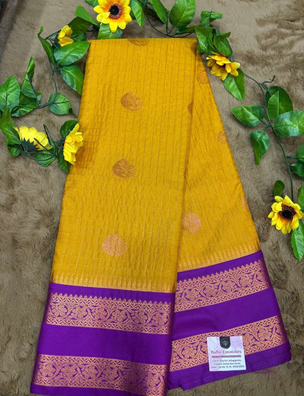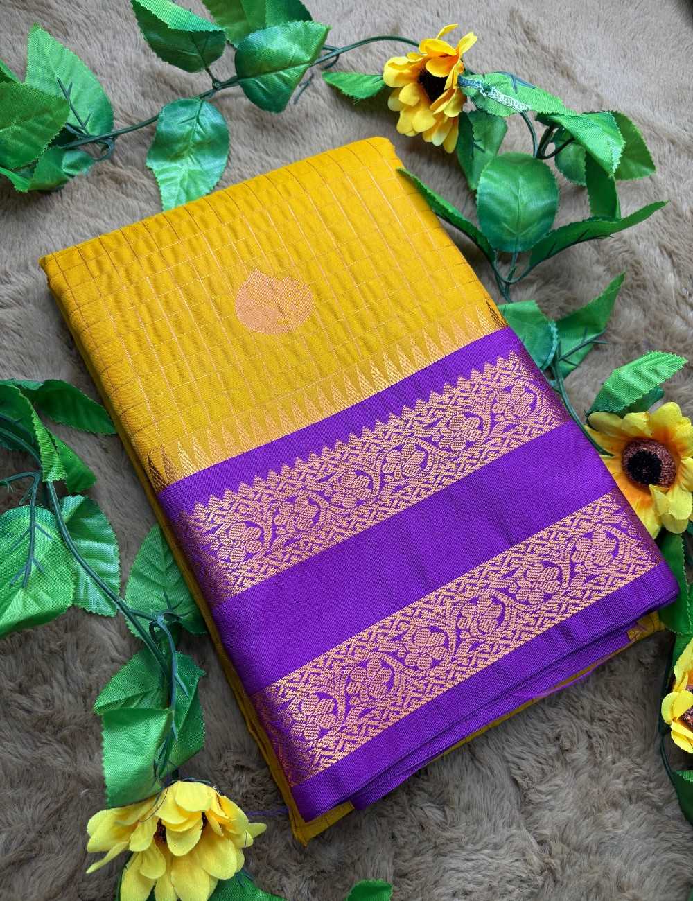 This vegan Kanchipuram saree offers lustrous sheen, rich texture, and elegant drape, perfect for weddings, festivals, and special occasions. The vibrant golden yellow and royal purple combination creates a striking appeal that’s both traditional and contemporary.